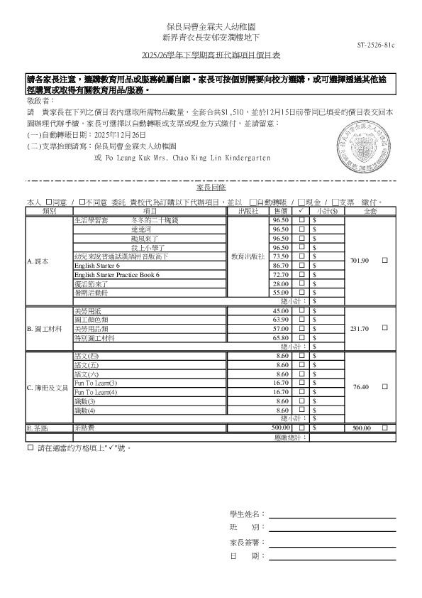 2025-2026學年(下學期)高班代辦書簿雜費表