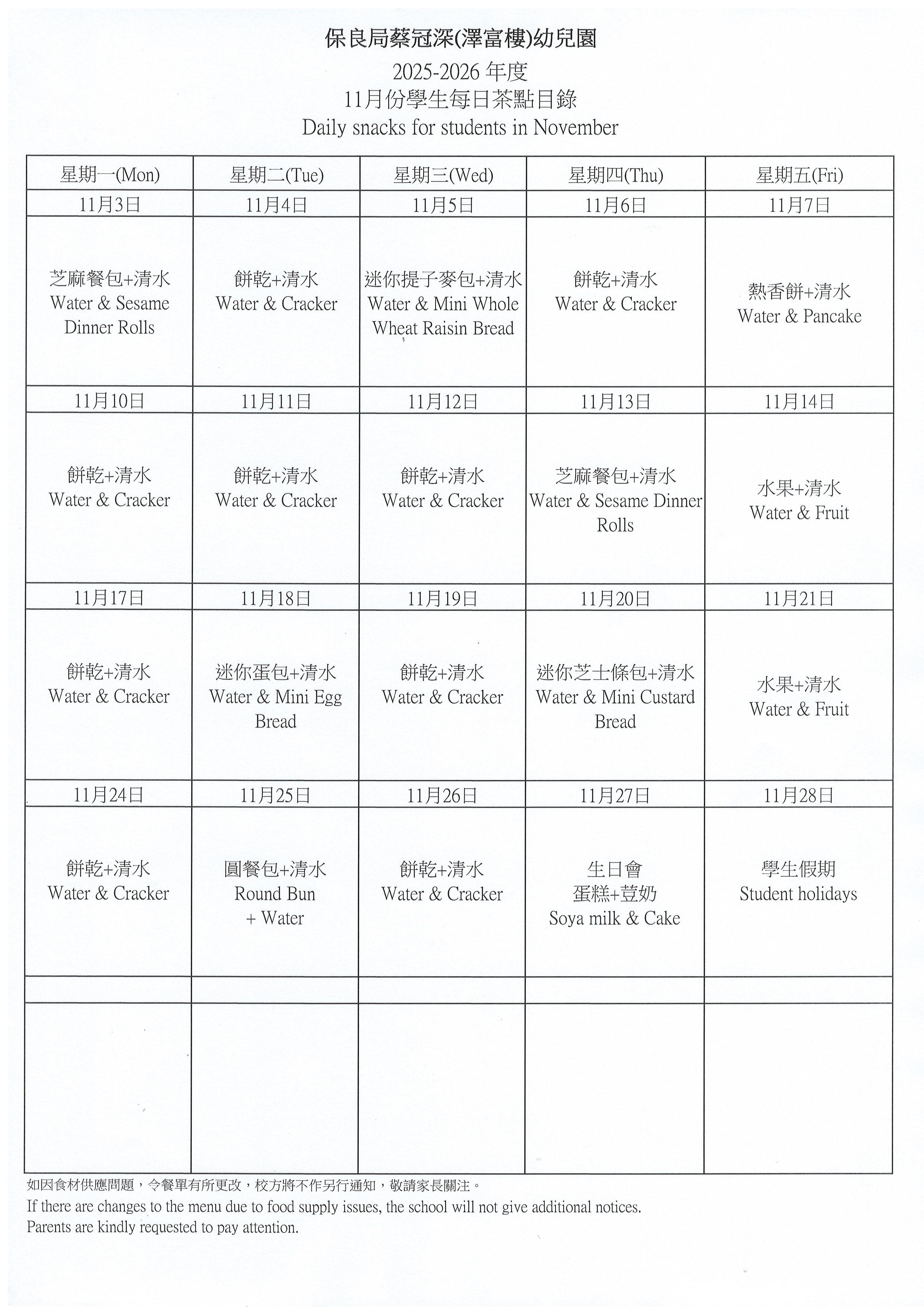 學生茶點 - 11月份