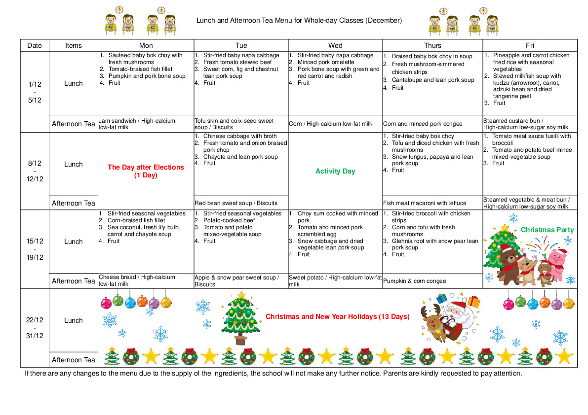 Lunch and Afternoon Tea Menu for Whole-day Classes (December)