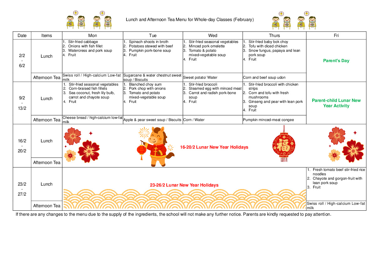 Lunch and Afternoon Tea Menu for Whole-day Classes (February)
