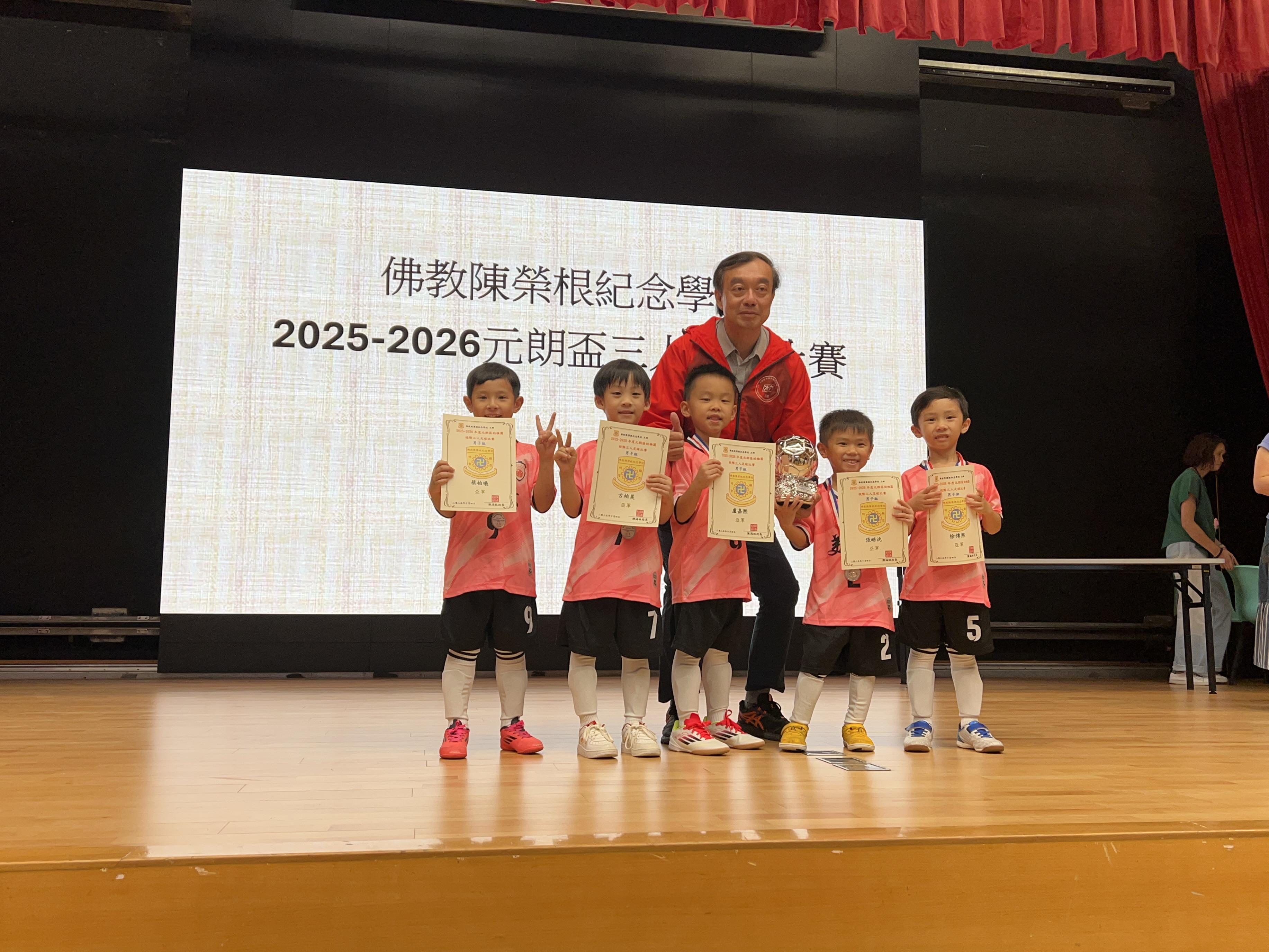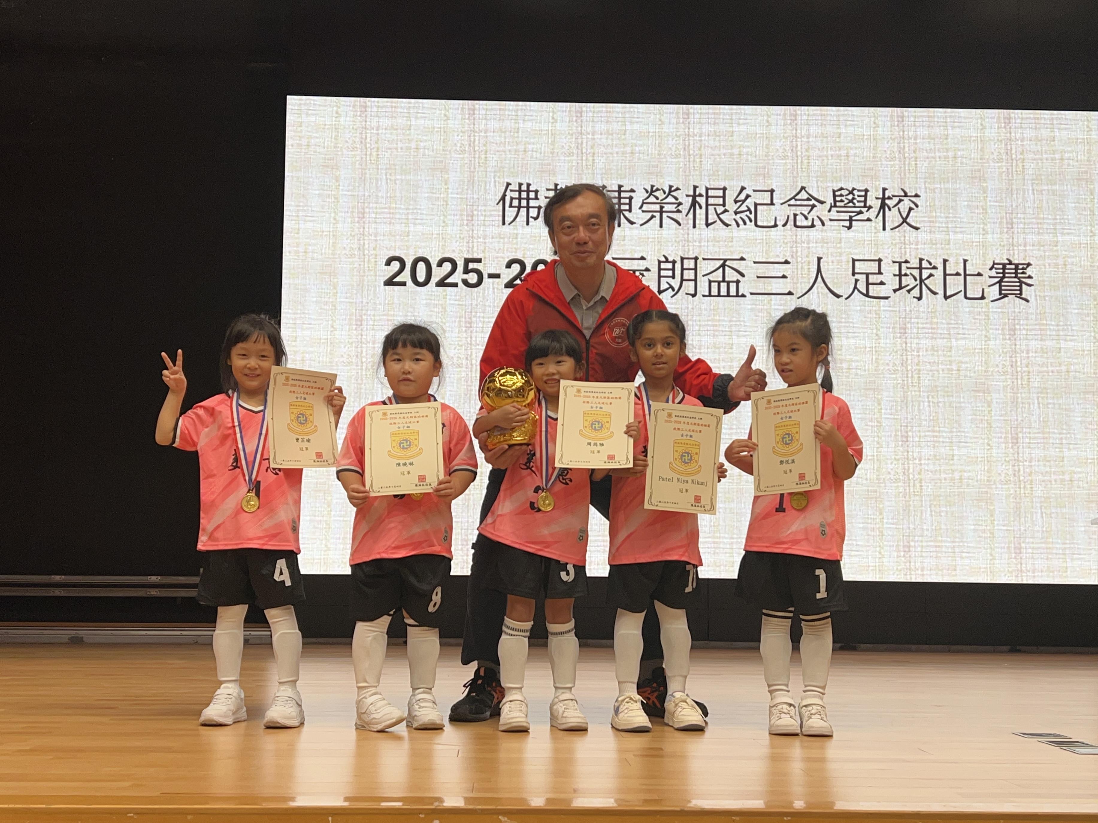 Our school's football team participated in the "2025-2026 Yuen Long Cup Kindergarten Three-a-Side Football Competition" organized by Buddhist Chan Wing Kan Memorial School, winning the championship in the girls' division and the 1st runner-up award in the boys' division.