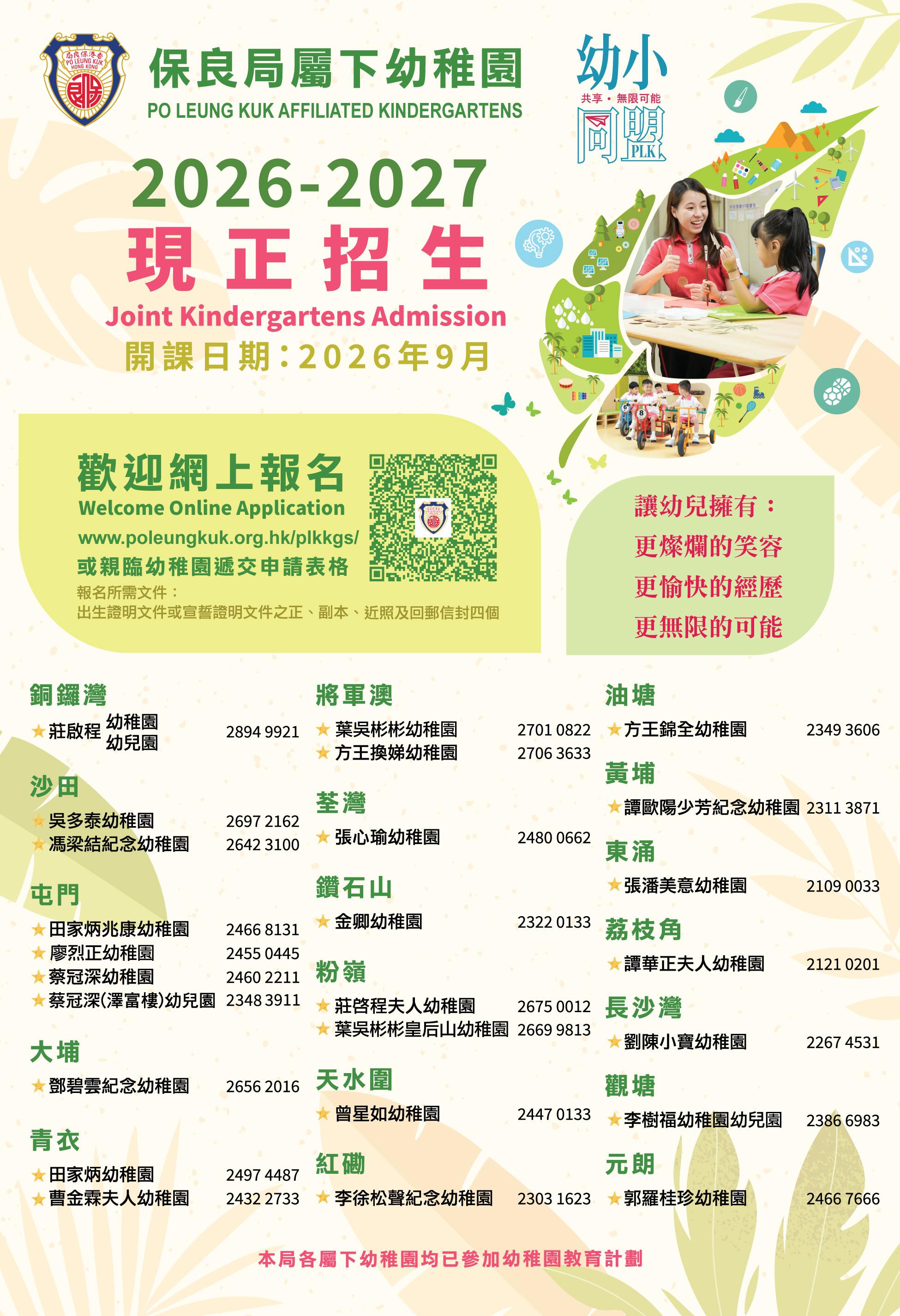 Po Leung Kuk Affiliated Kindergartens Joint Kindergartens Admission 2026-2027