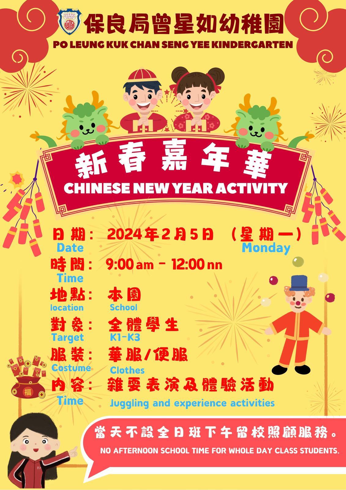 農曆新年將至,本園將於2月5日(星期一)舉辦「新春嘉年華」活動。除了模擬年宵市場,今年更設有雜耍表演環節,內容豐富,定能讓幼兒認識中華文化及感受節日的氣氛,愉快地迎接農曆新年!