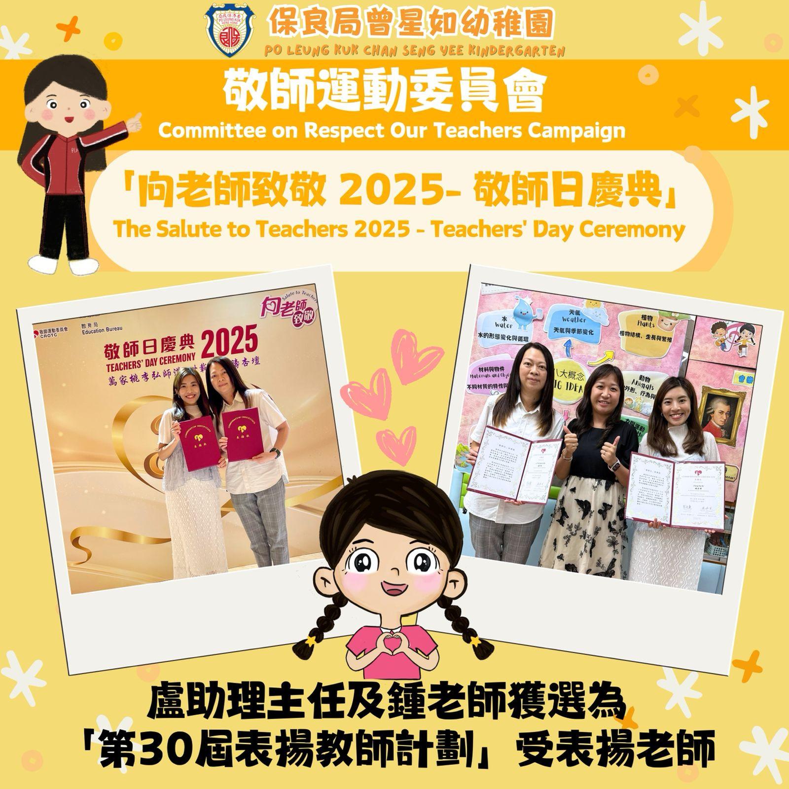 恭賀本校盧助理主任及鍾老師榮獲「第30屆表揚教師計劃」中的優秀教師嘉許,卓越的教學表現獲得表揚。她們更獲邀出席由敬師運動委員會主辦的「向老師致敬2025一敬師日慶典」接受如此榮譽的嘉許,再次證明本校具有教學表現優秀的教師團隊。