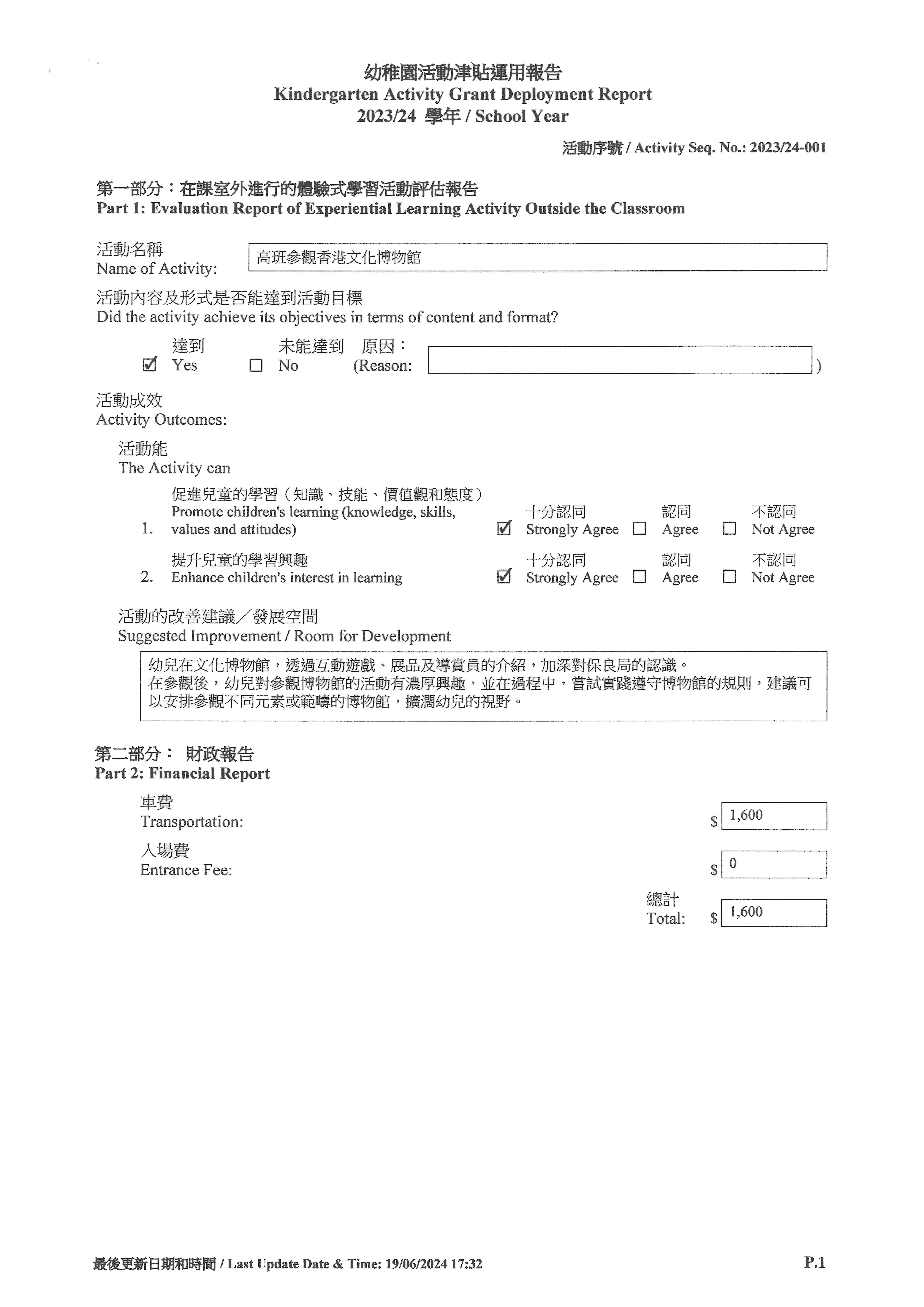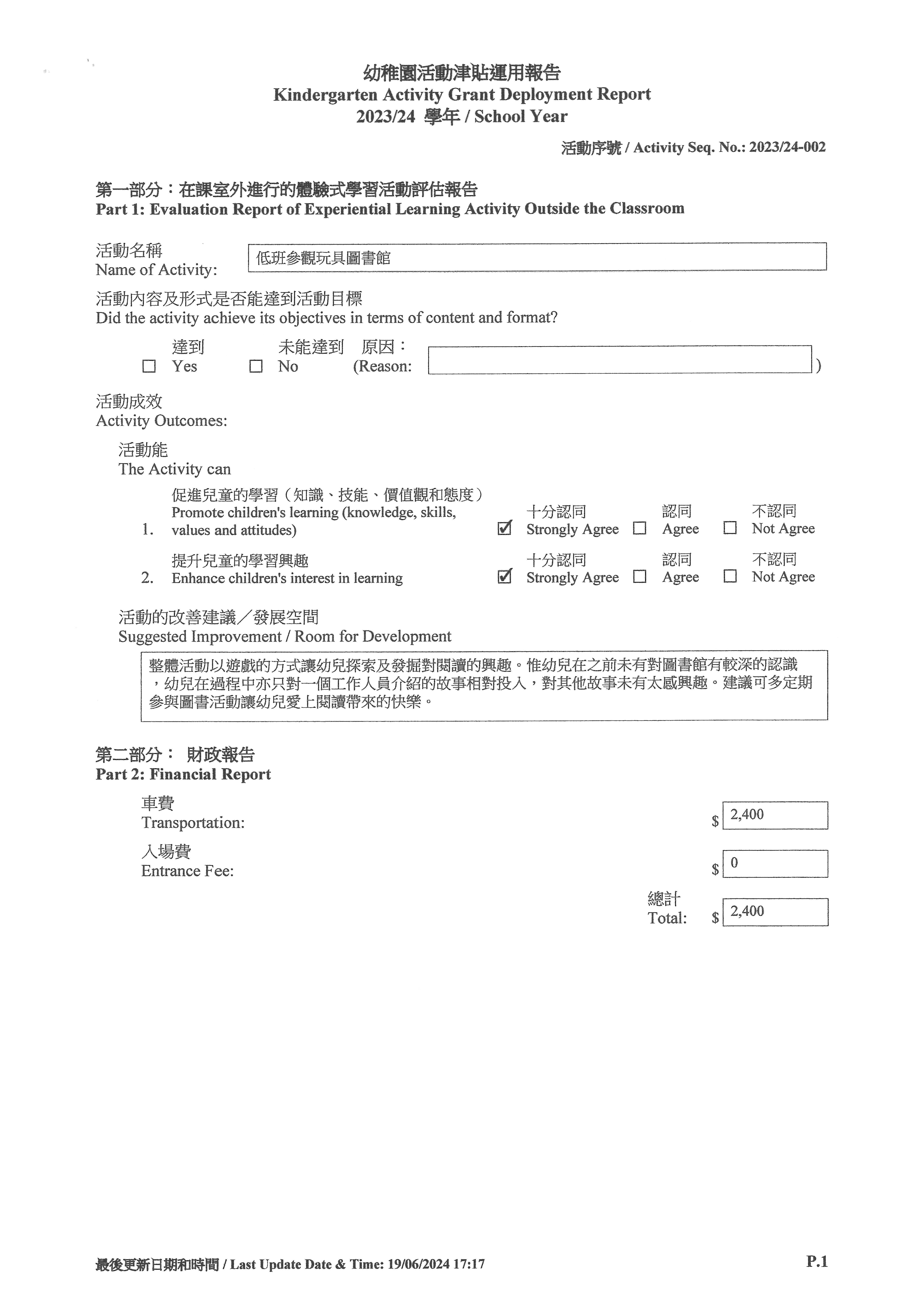 Kindergarten Activity Grant Deployment Report 2023-24