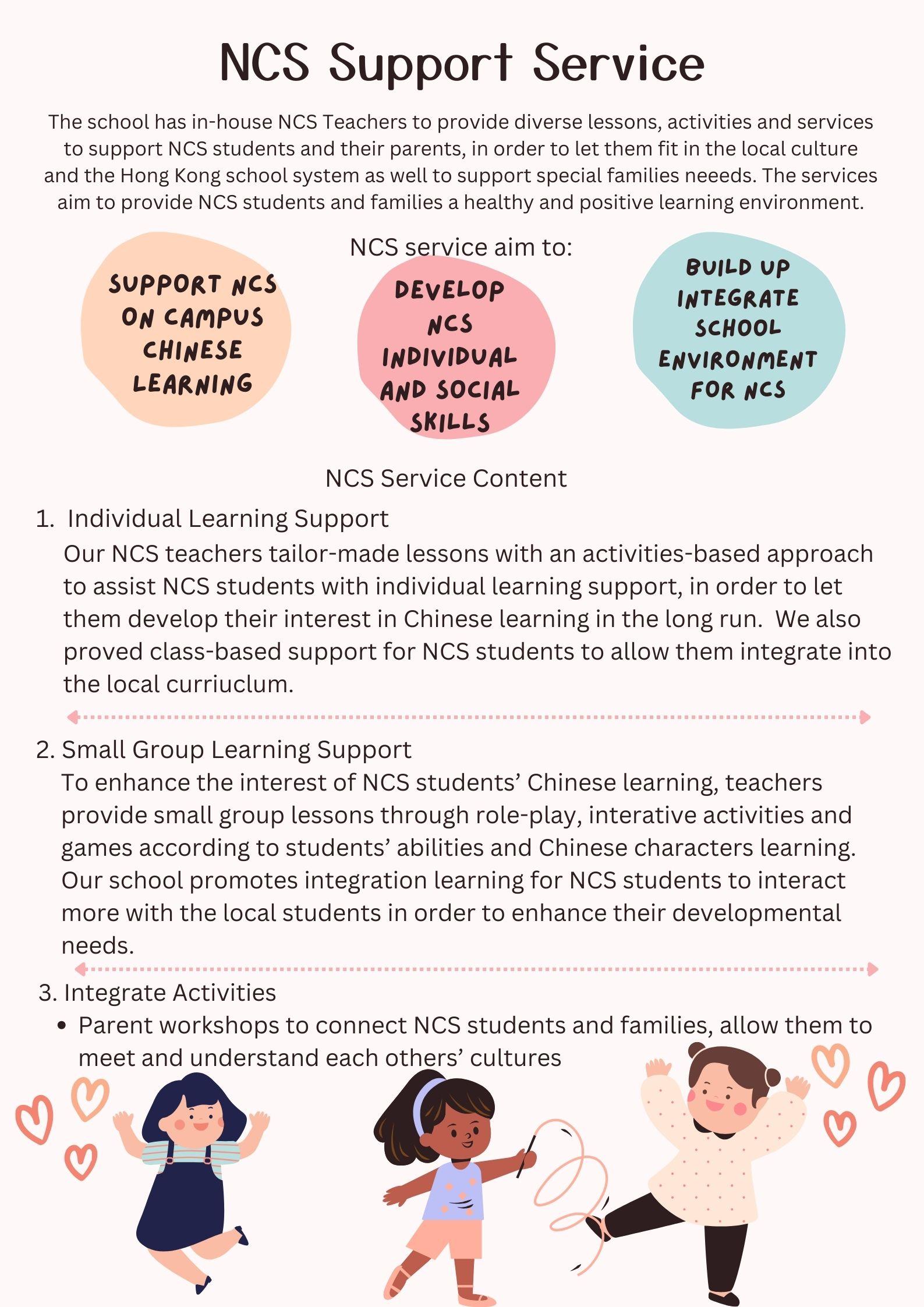 When interviewing NCS children, interpretation and/or translation service for applicants will be provided where necessary, or parents and children are allowed to be accompanied by a Chinese speaking relative/friend to facilitate communication.