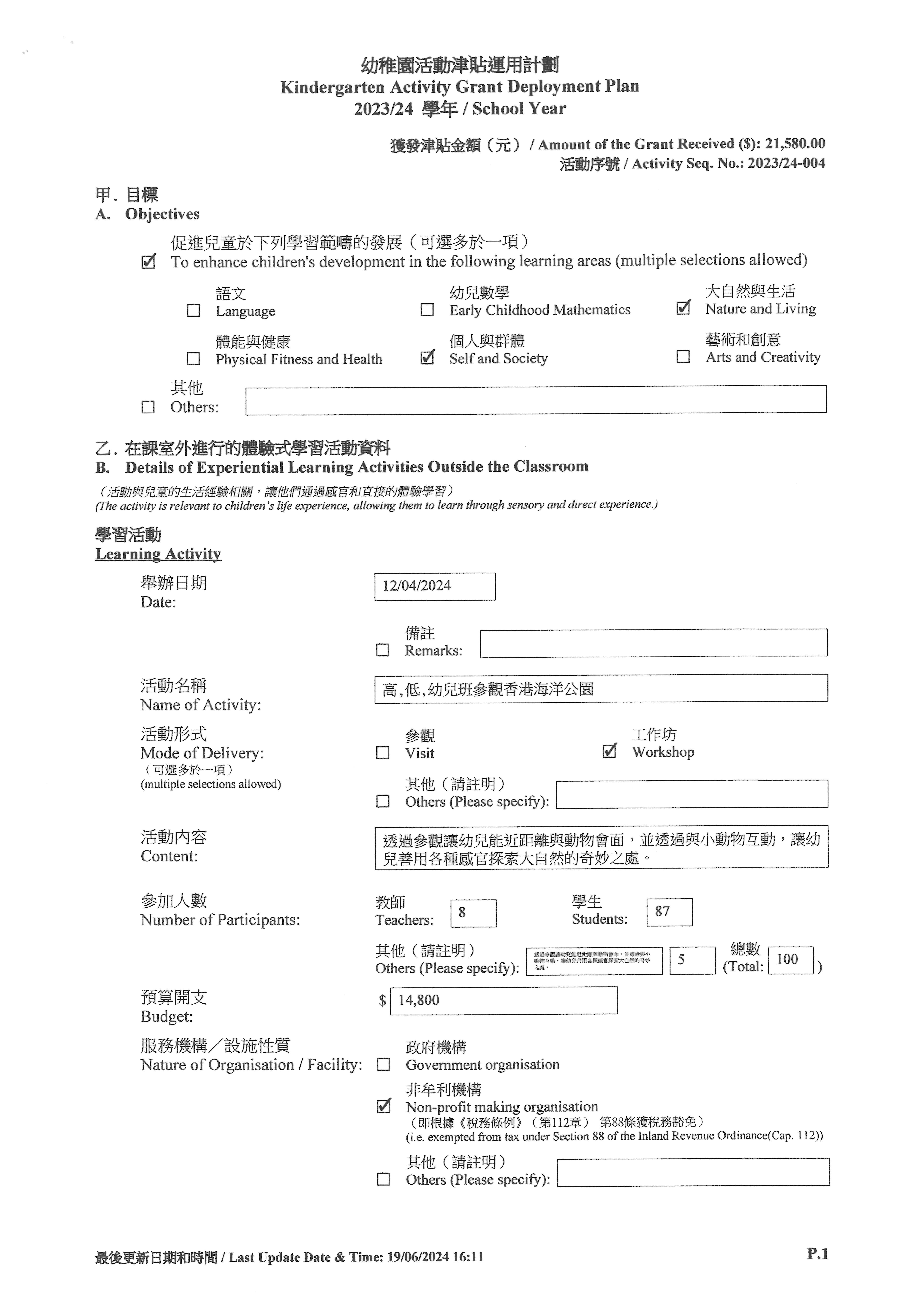 2023-2024學年幼兒園活動津貼計劃