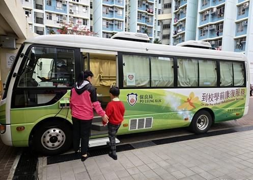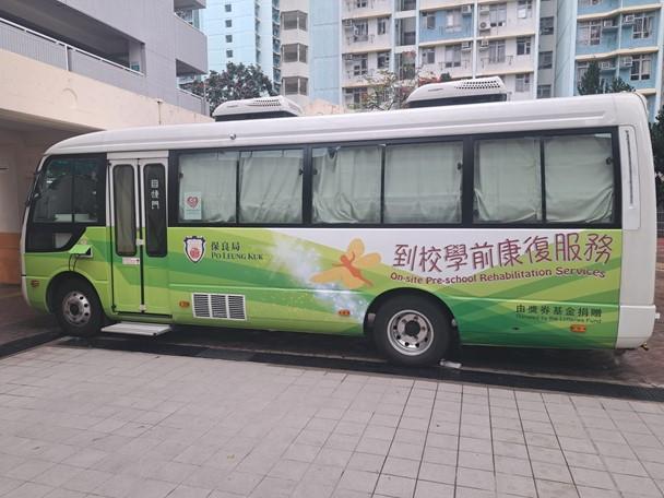 Under the guidance of a Special Child Care Worker, children receive training at the Pre-school Rehabilitation Service's professional therapy vehicle.