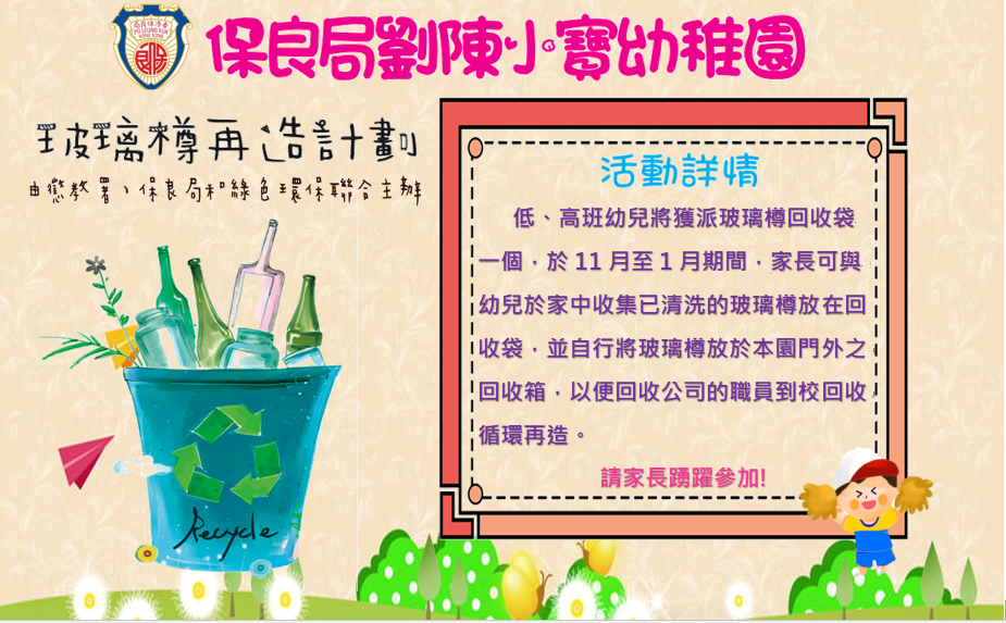 本園擬於11月至1月期間,參與由懲教署、保良局和綠色環保聯合主辦《玻璃樽再造計劃》。低、高班幼兒將獲派玻璃樽回收袋一個,家長可與幼兒於家中收集已清洗的玻璃樽放在回收袋,並自行將玻璃樽放於本園門外之回收箱,以便回收公司的職員到校回收循環再造,請家長踴躍參加。