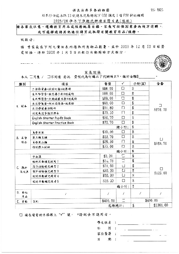 2025/26學年下學期代辦項⽬價⽬表(低班)