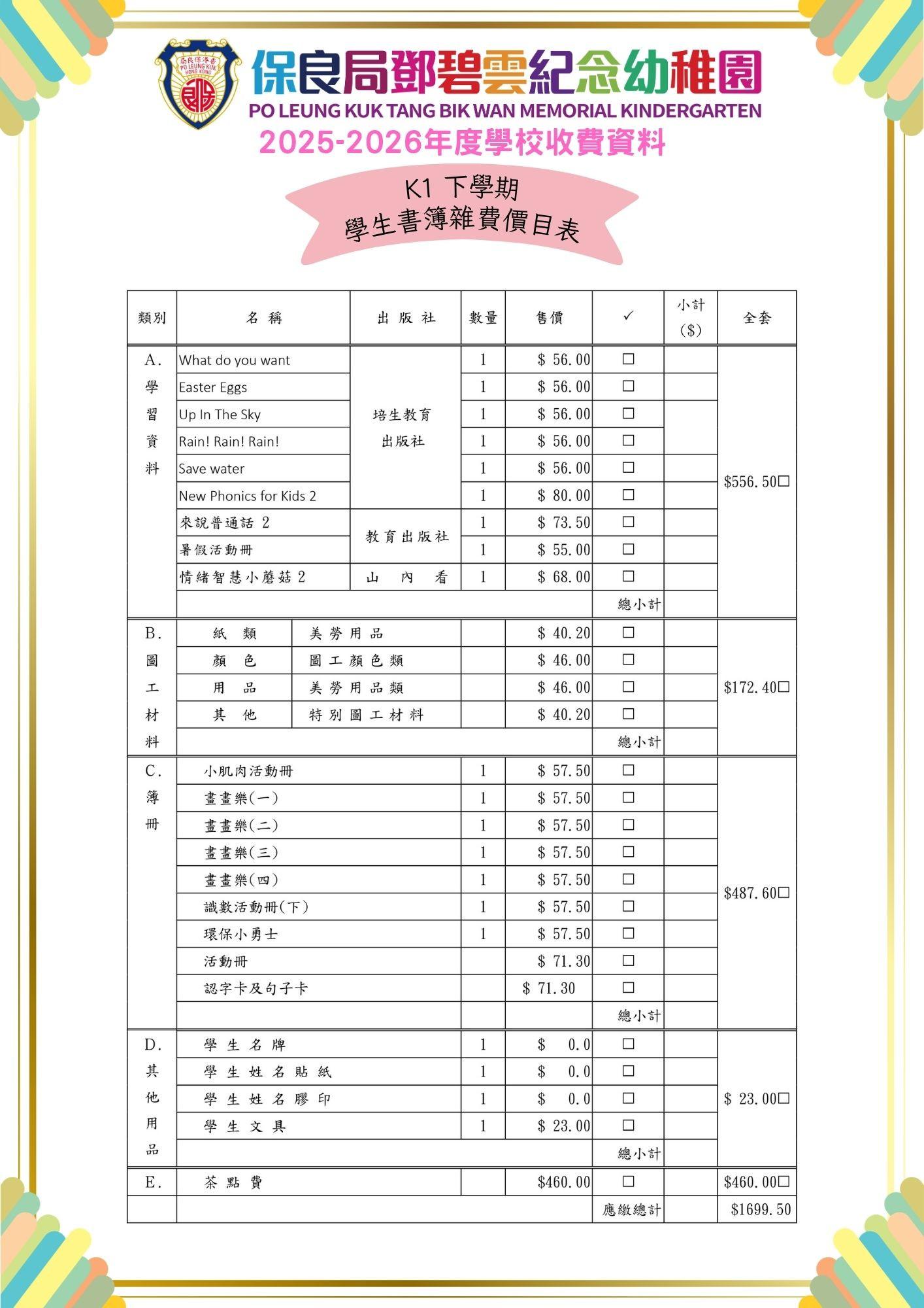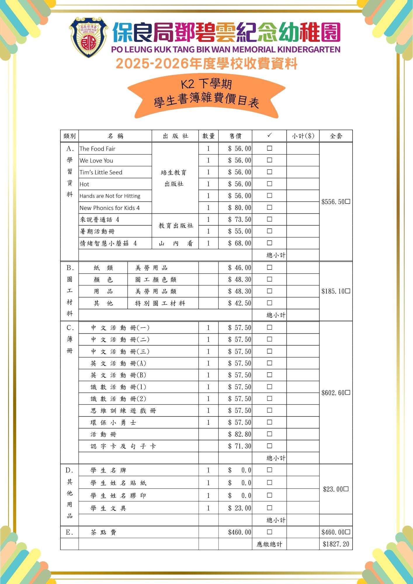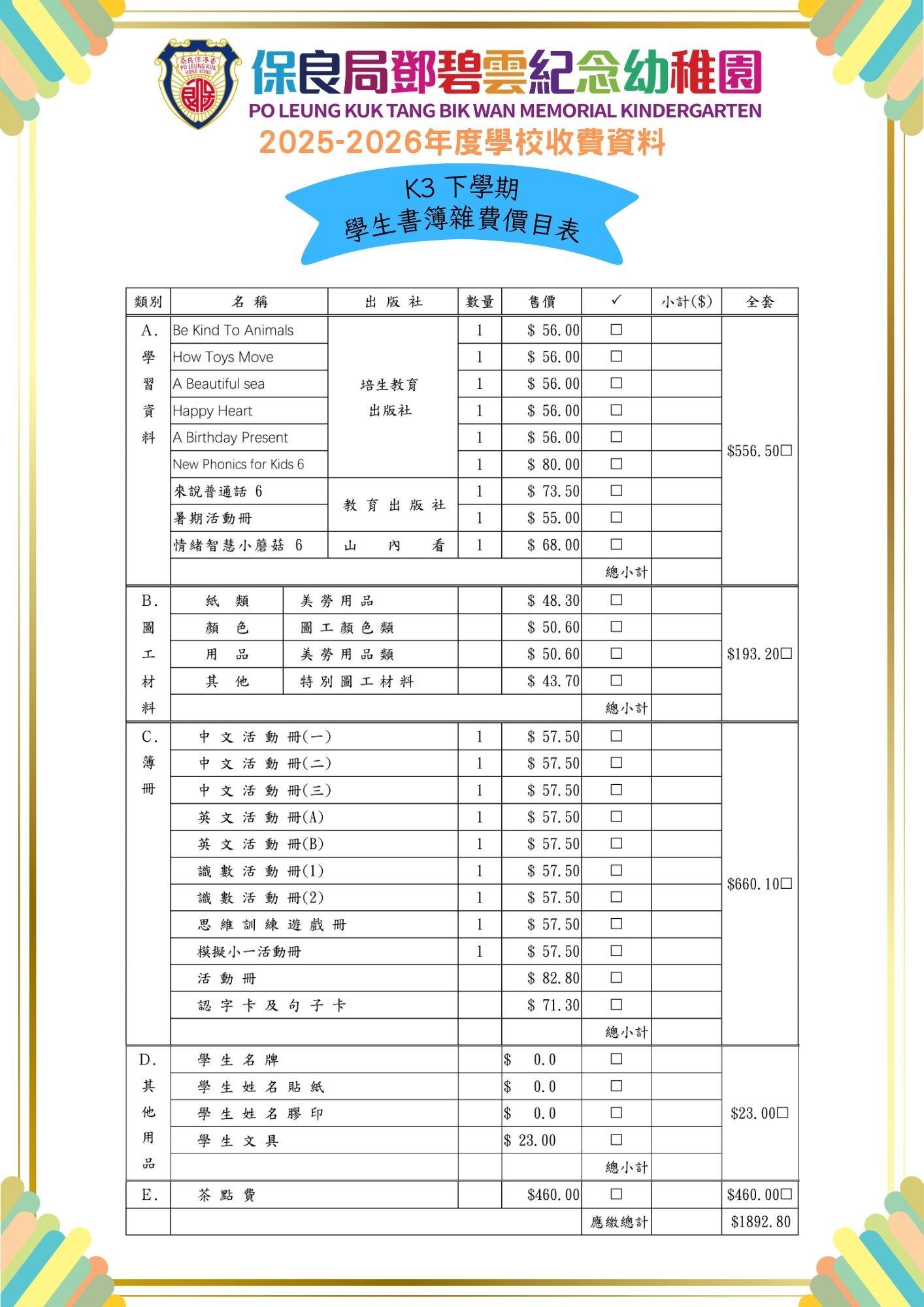 2025-2026 年度下學期學生書簿雜費價目表