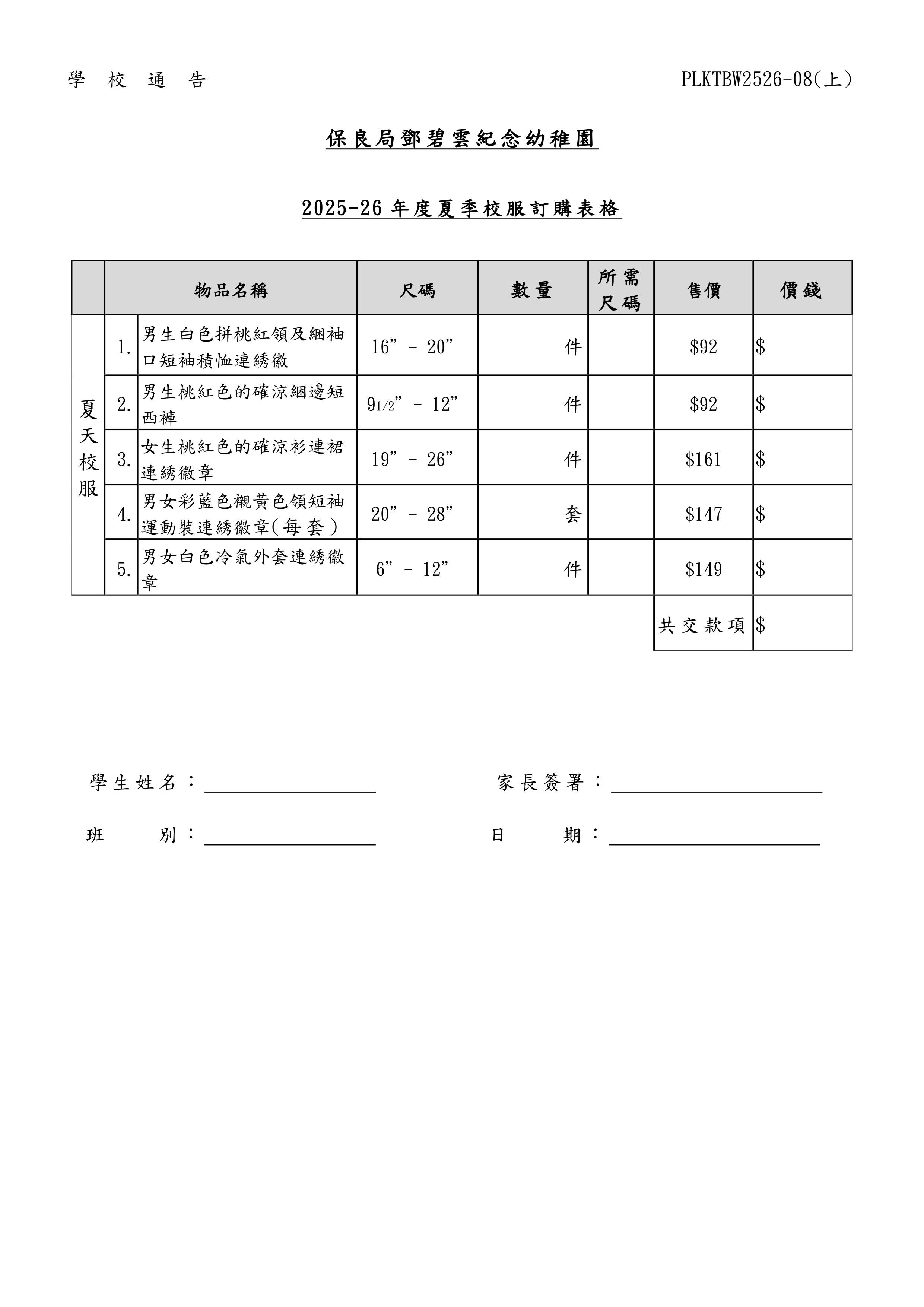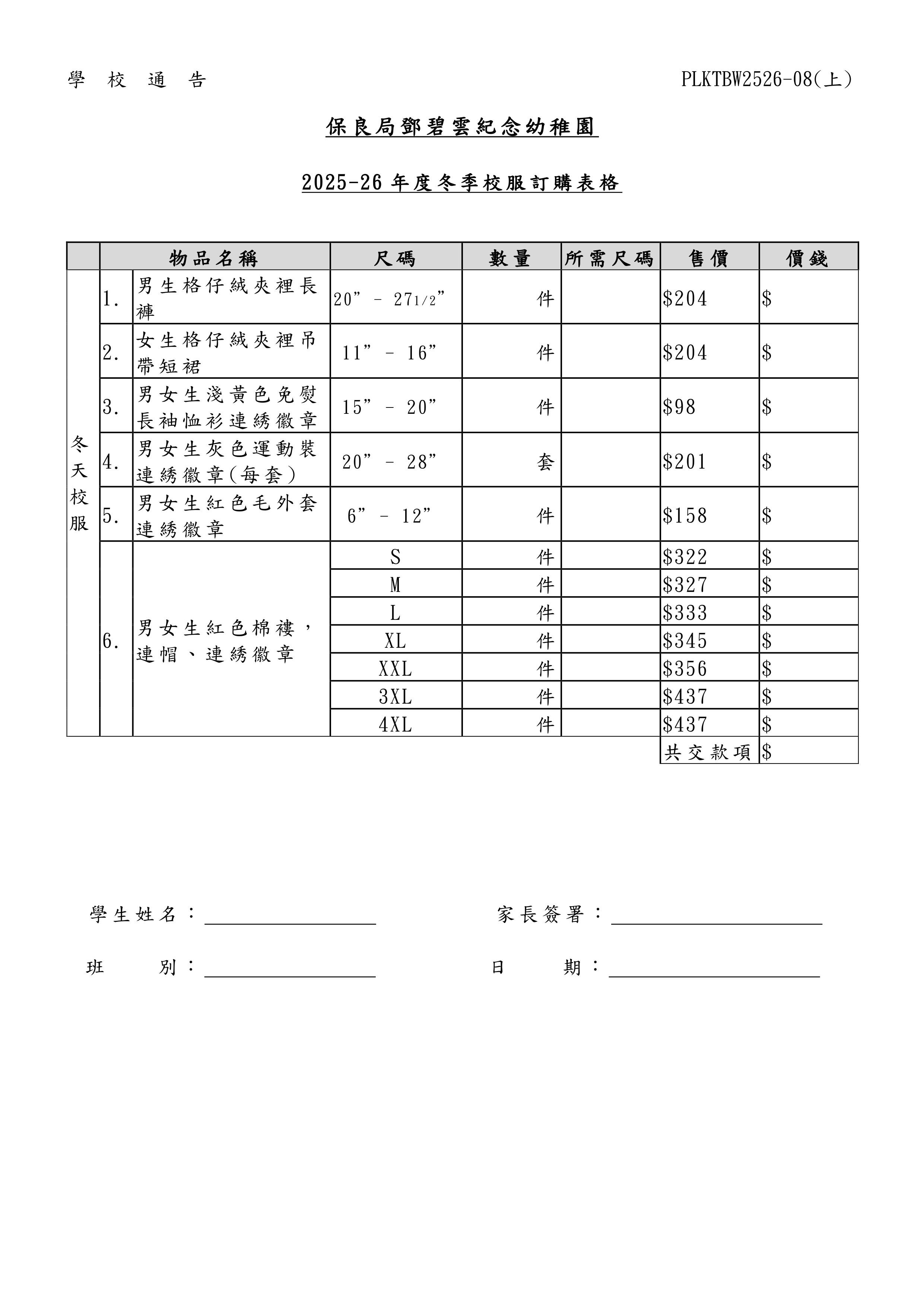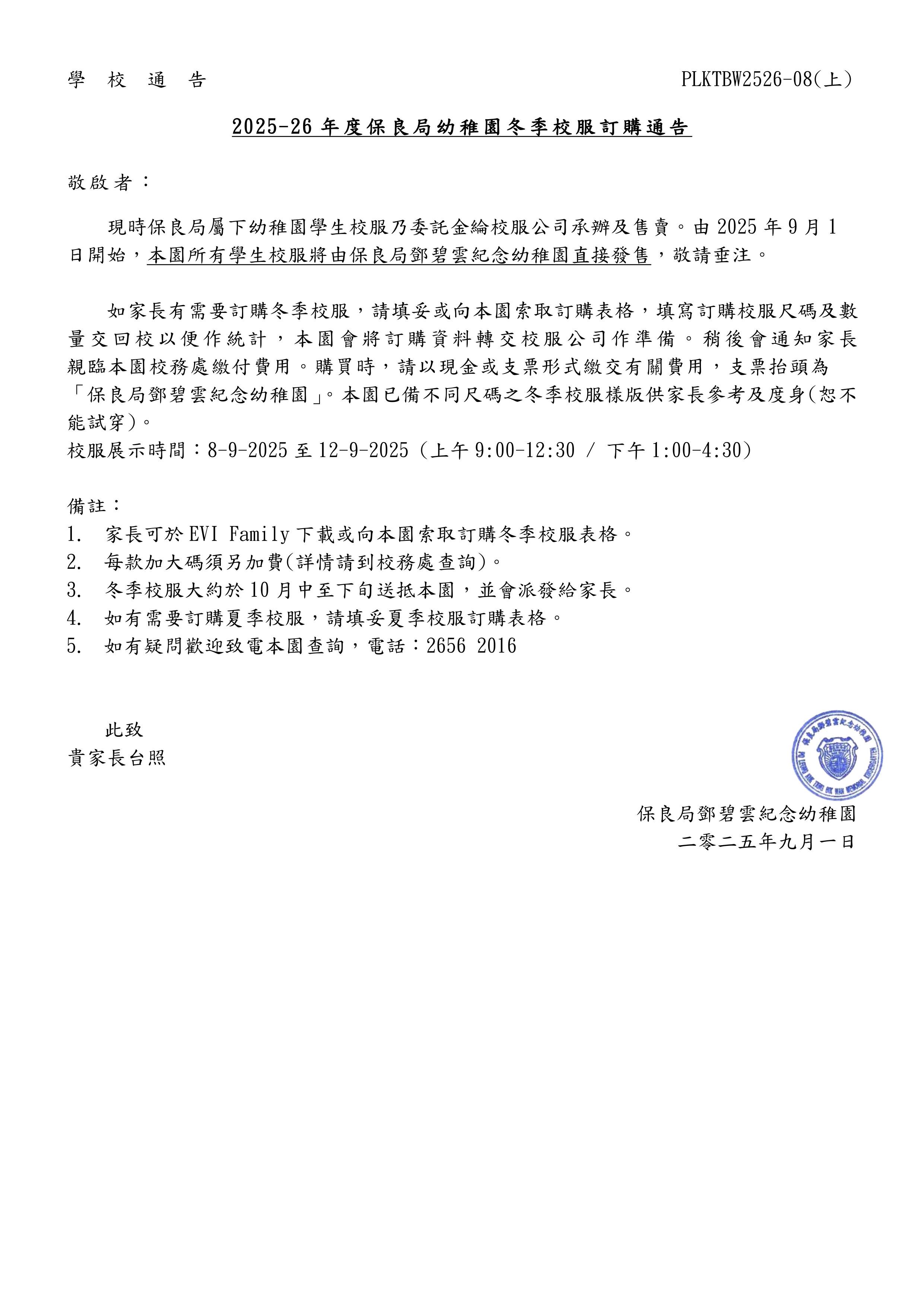 2025-26年度保良局幼稚園冬季校服訂購通告