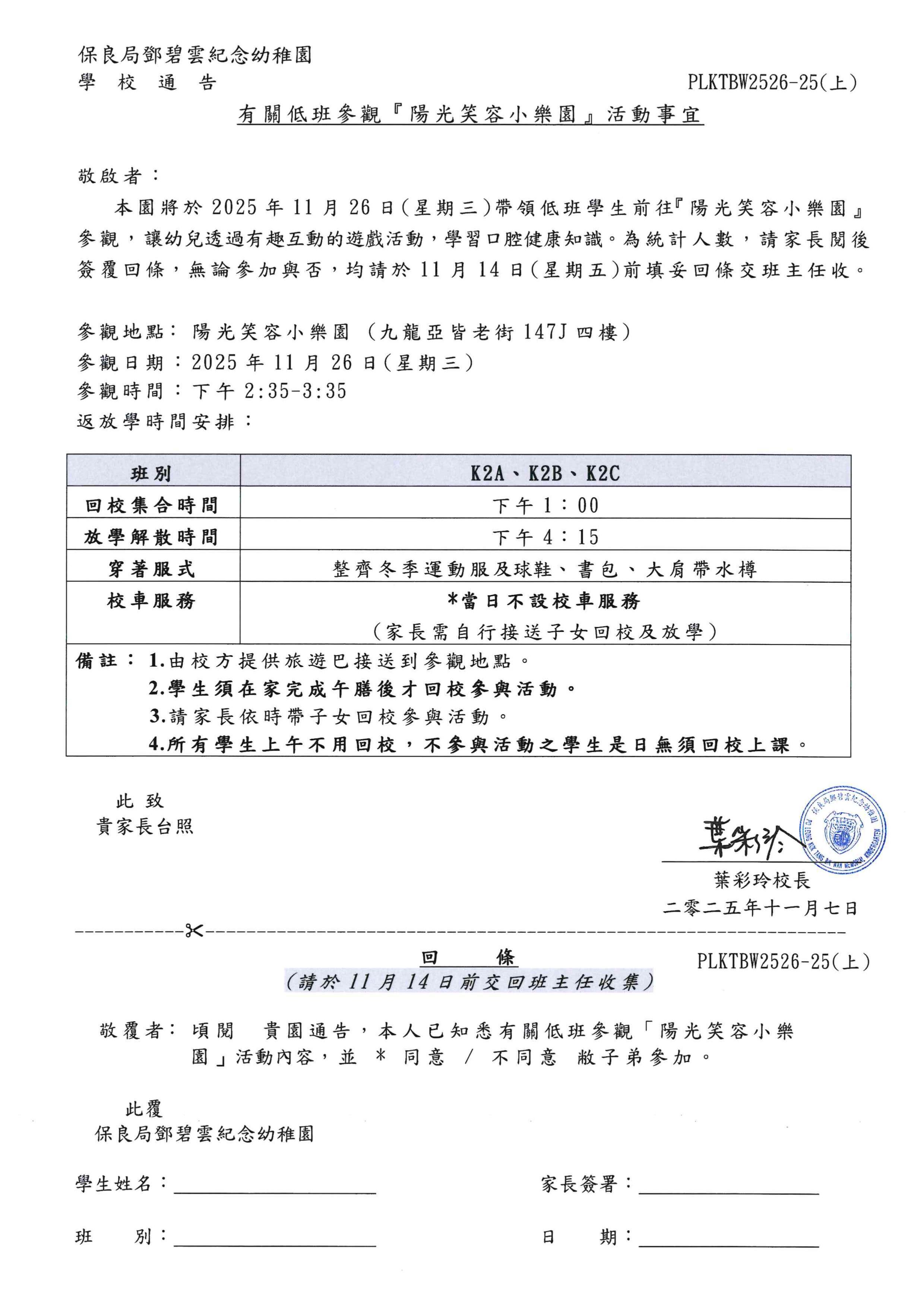 有關低班參觀『陽光笑容⼩樂園』活動事宜