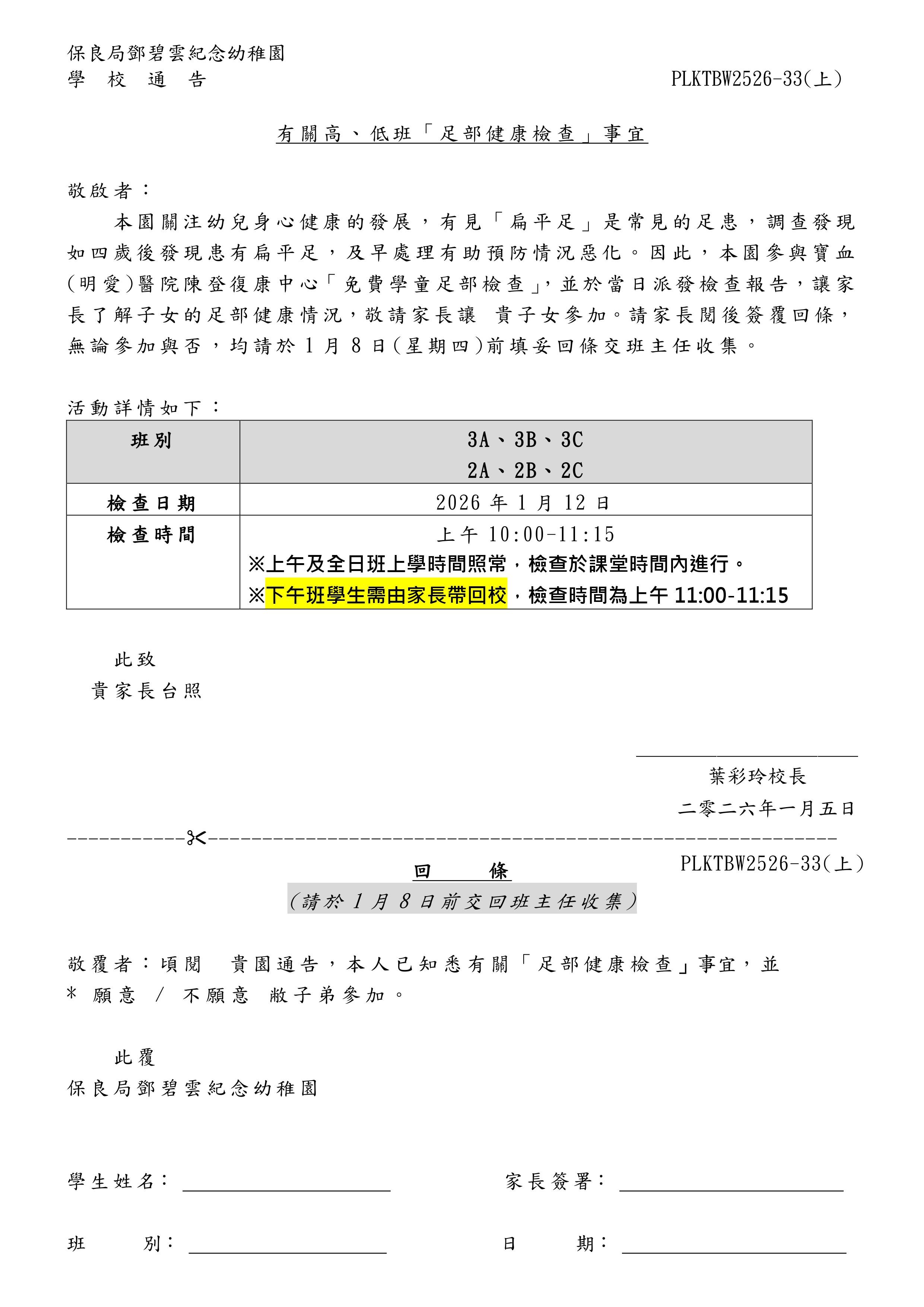 有關高、低班「足部健康檢查」事宜