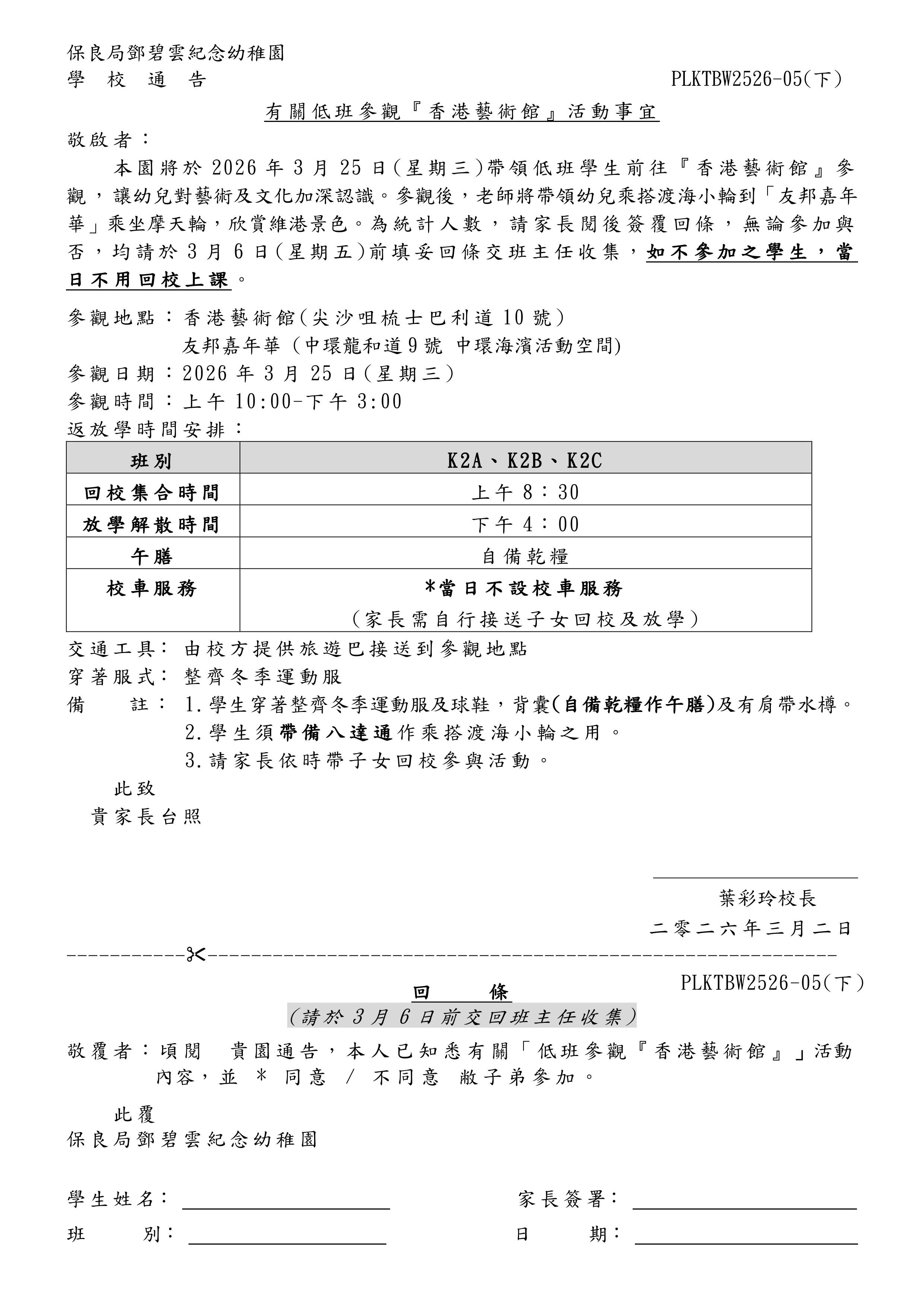 有關低班參觀『香港藝術館』活動事宜