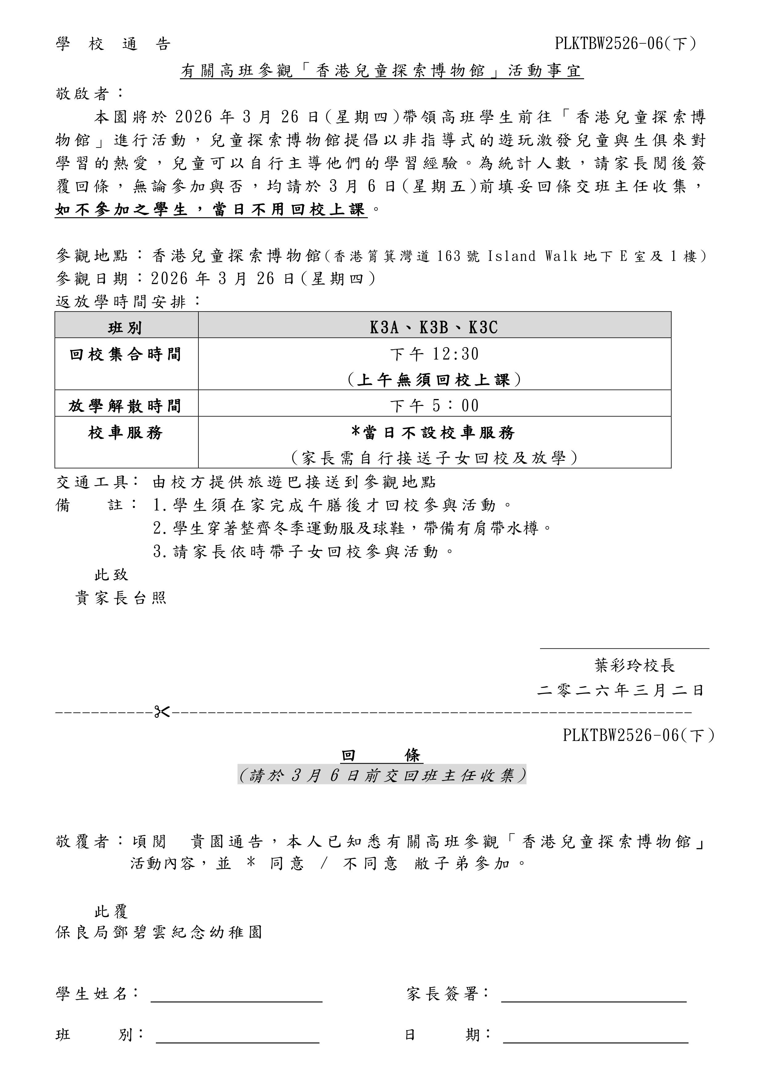 有關高班參觀「香港兒童探索博物館」活動事宜