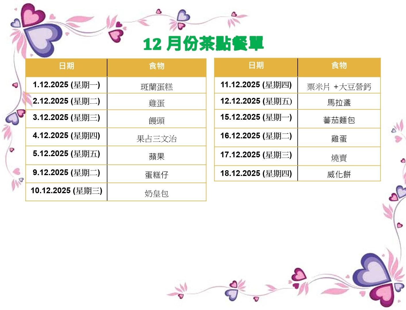 12月茶點餐單