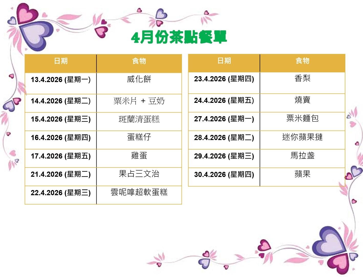 4月茶點餐單