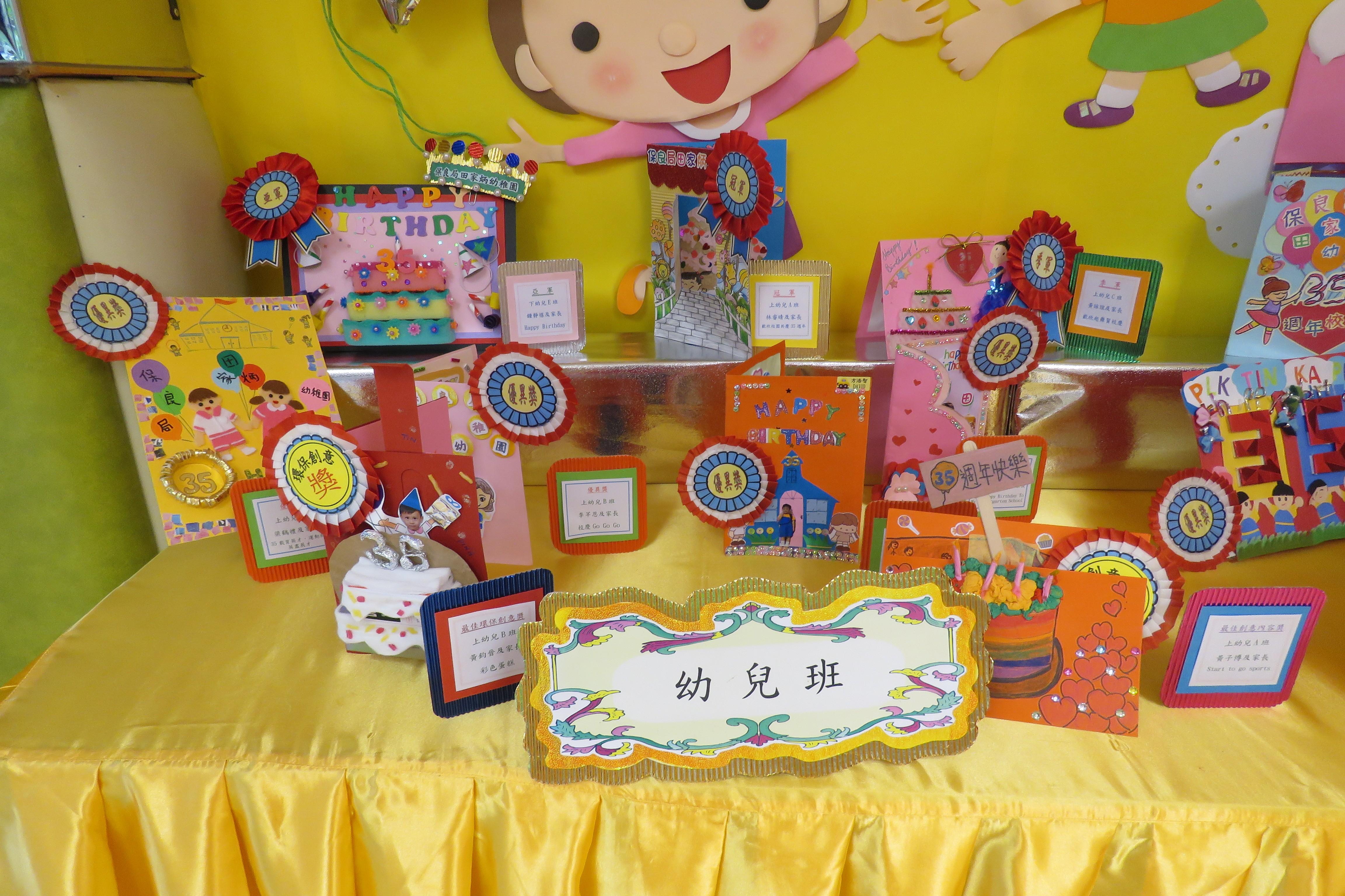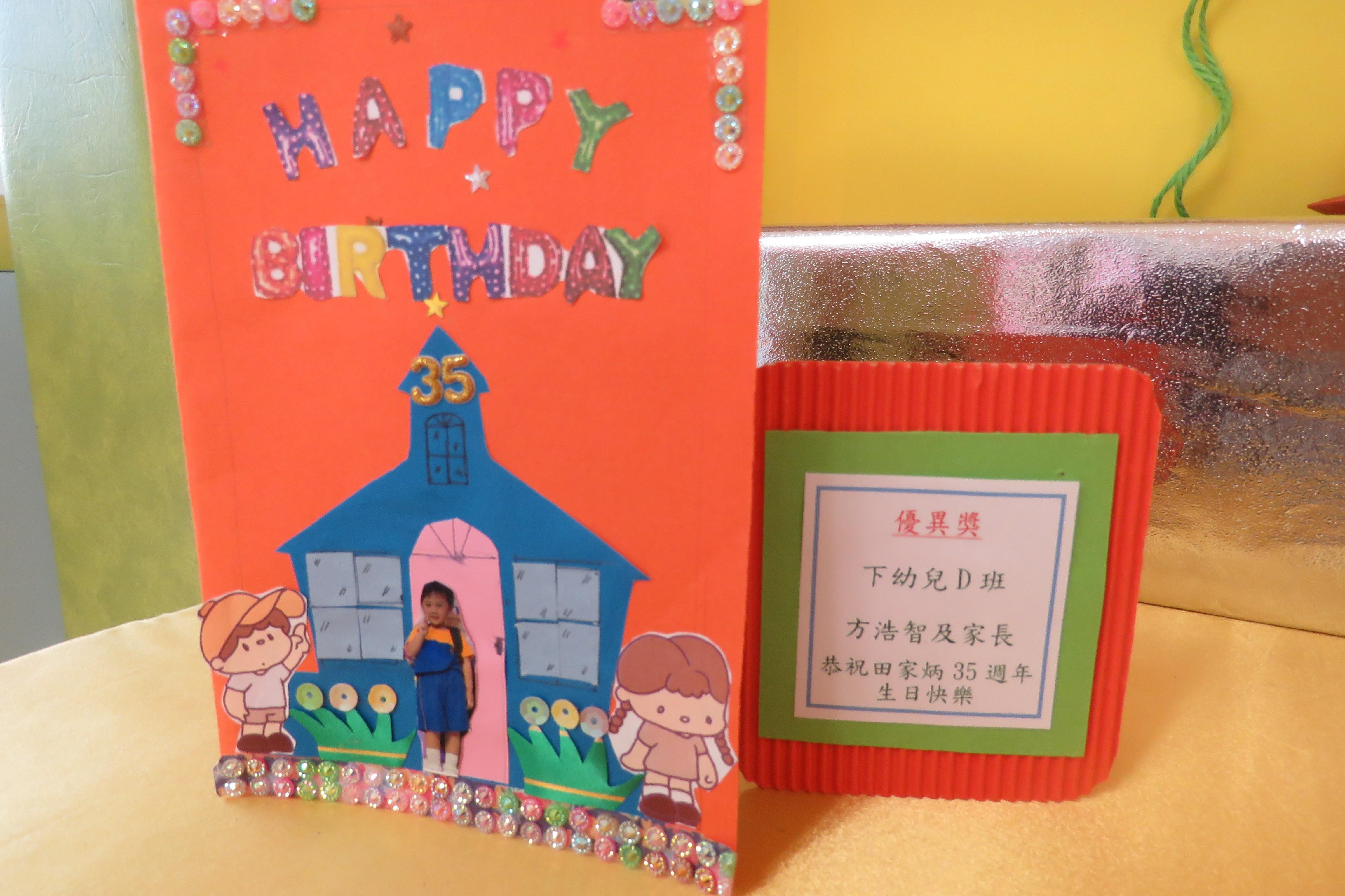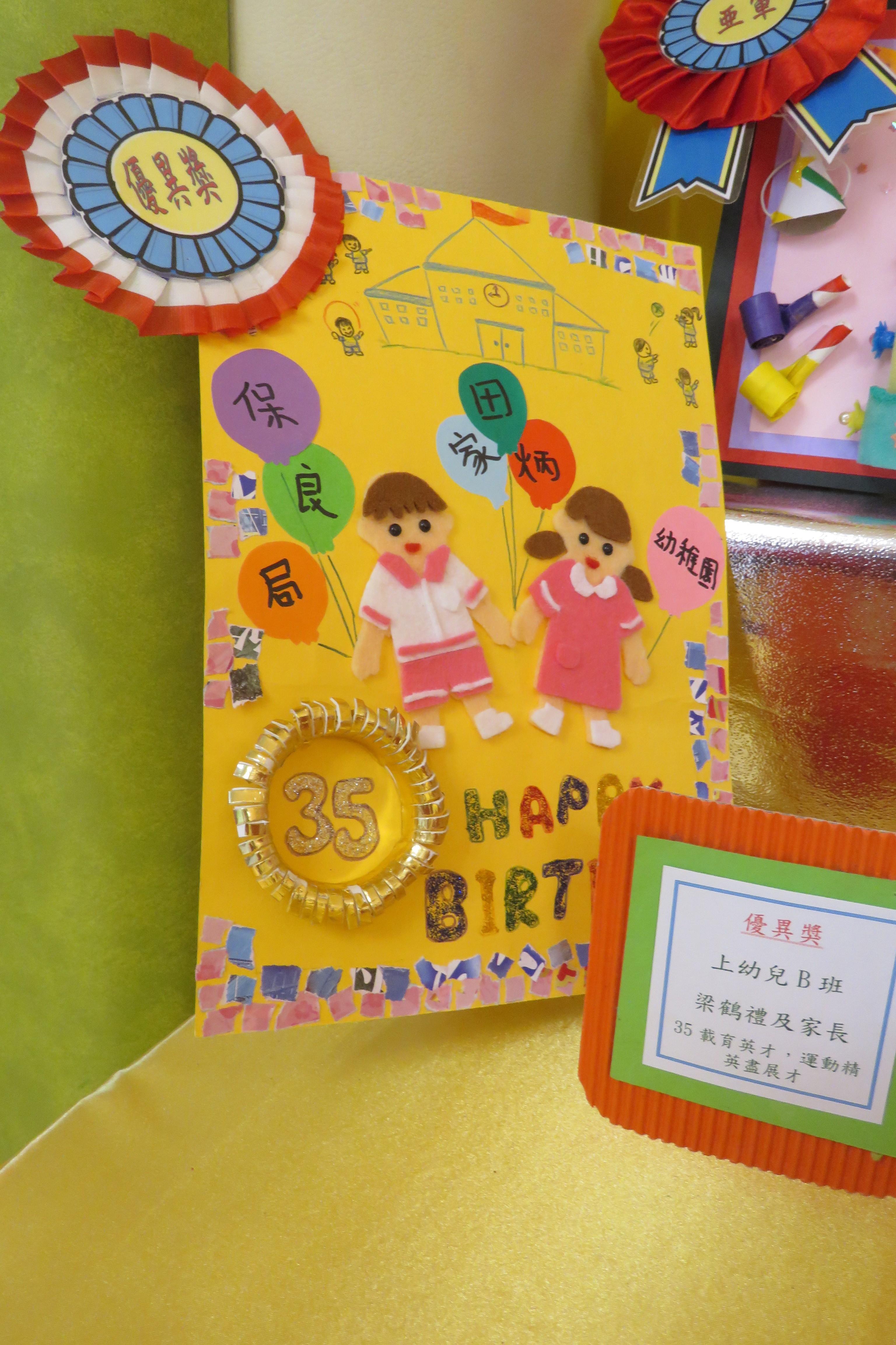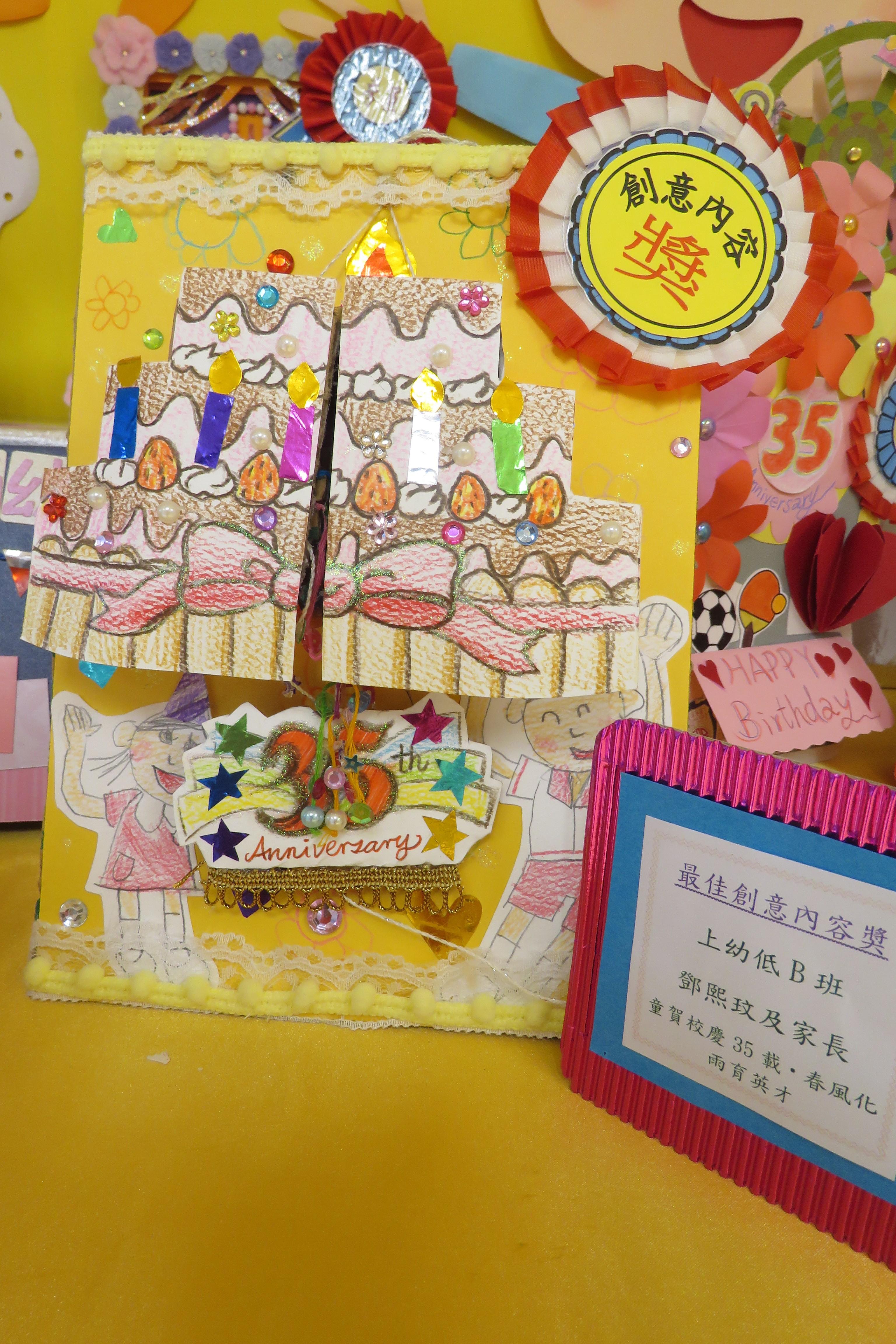 35週年校慶生日卡設計比賽 已完滿結束,各家長積極參與及支持,共收集了171份參賽作品。經本園評審後,每級選出冠、亞、季各一名,最佳創意內容奬各一名,最佳環保創意奬各一名,優異奬各四名,得奬作品如下 :