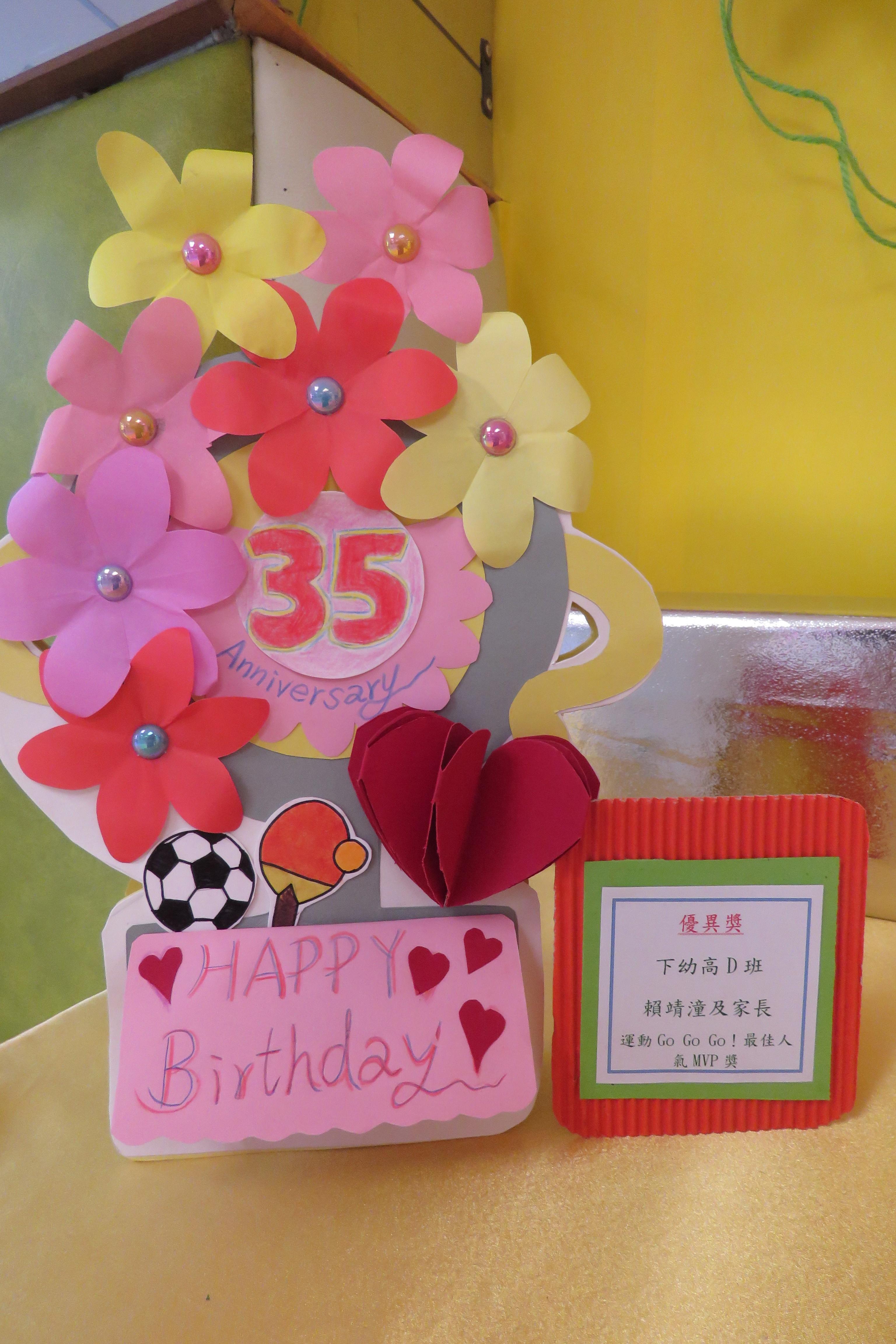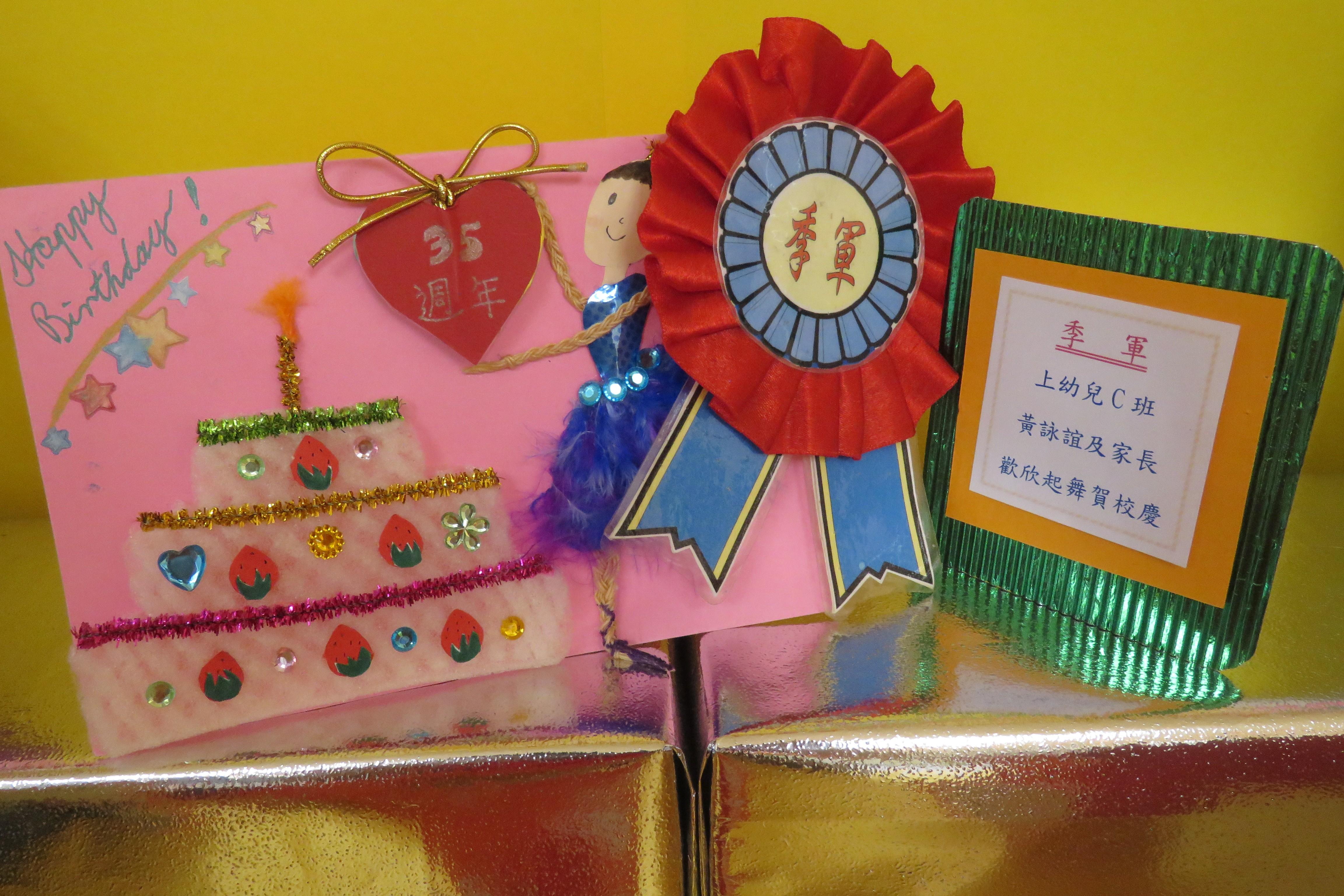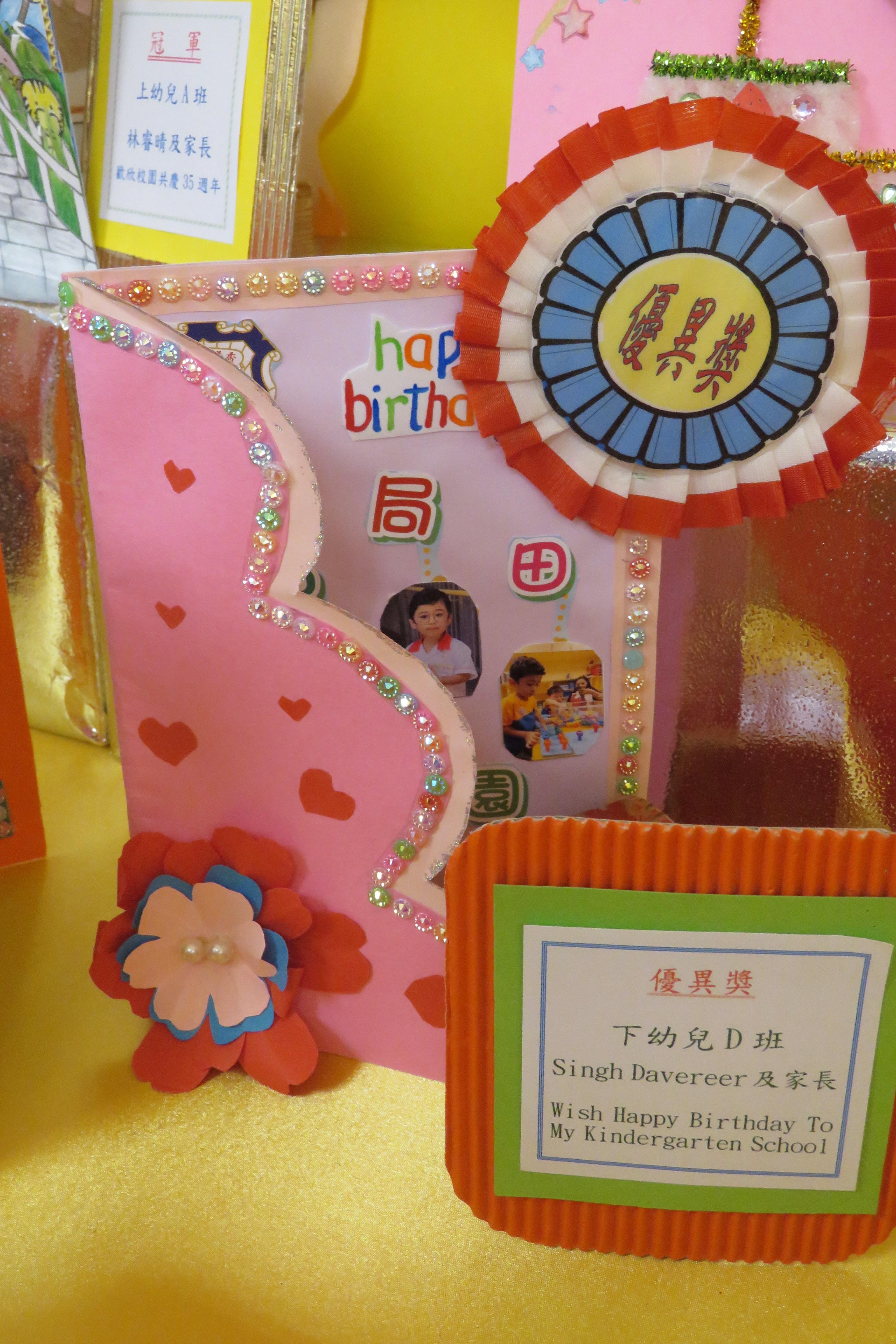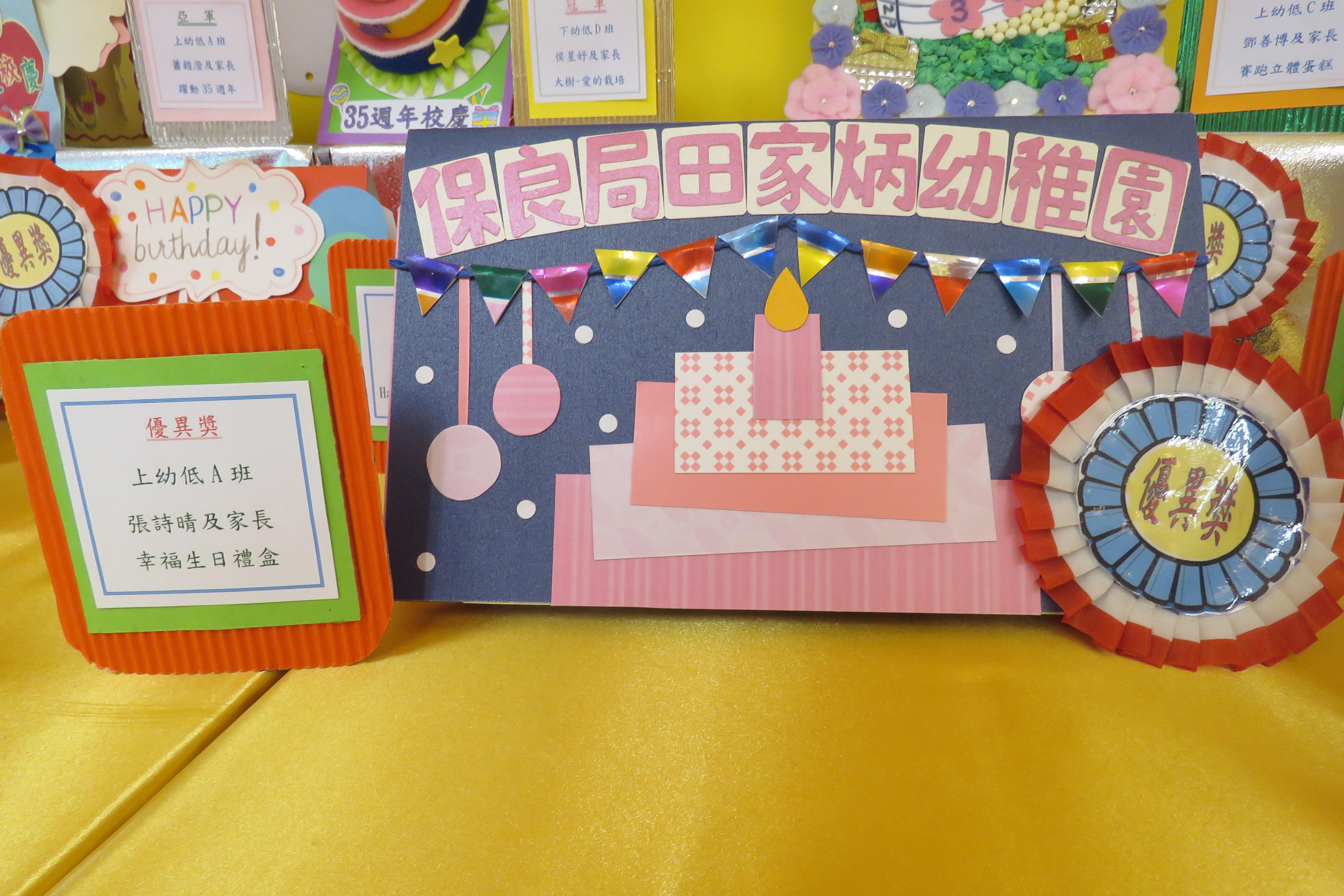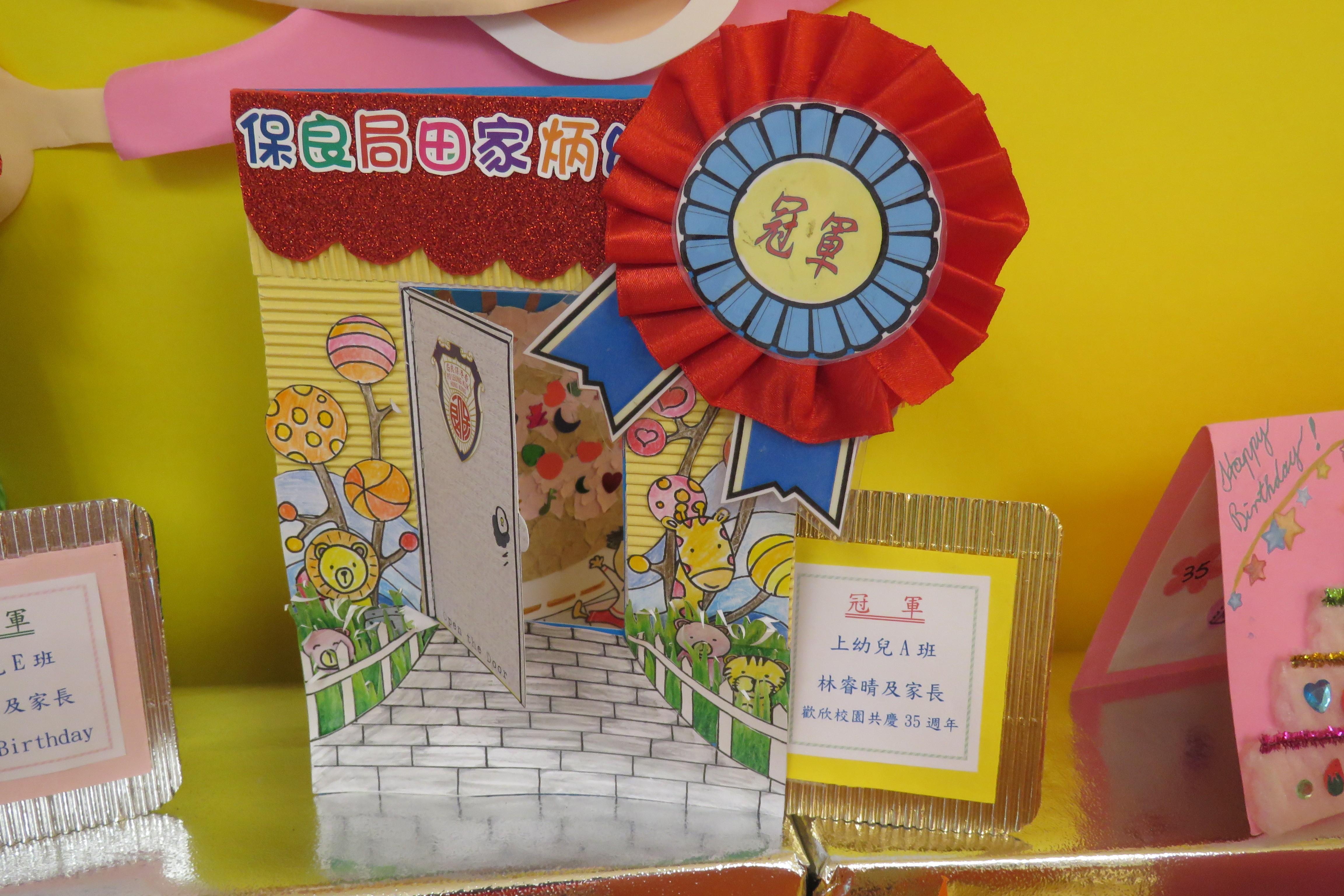 35週年校慶生日卡設計比賽 已完滿結束,各家長積極參與及支持,共收集了171份參賽作品。經本園評審後,每級選出冠、亞、季各一名,最佳創意內容奬各一名,最佳環保創意奬各一名,優異奬各四名,得奬作品如下 :