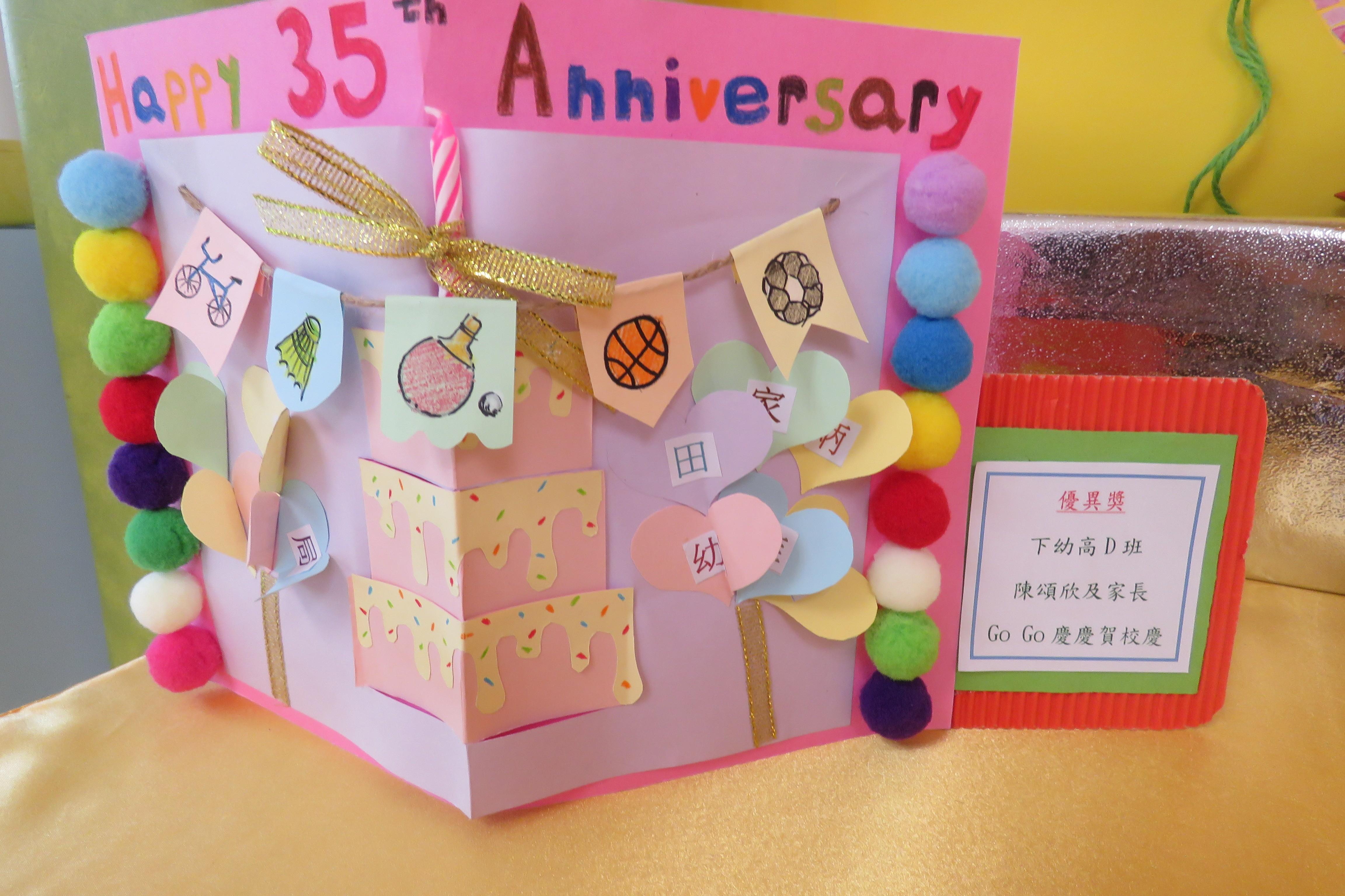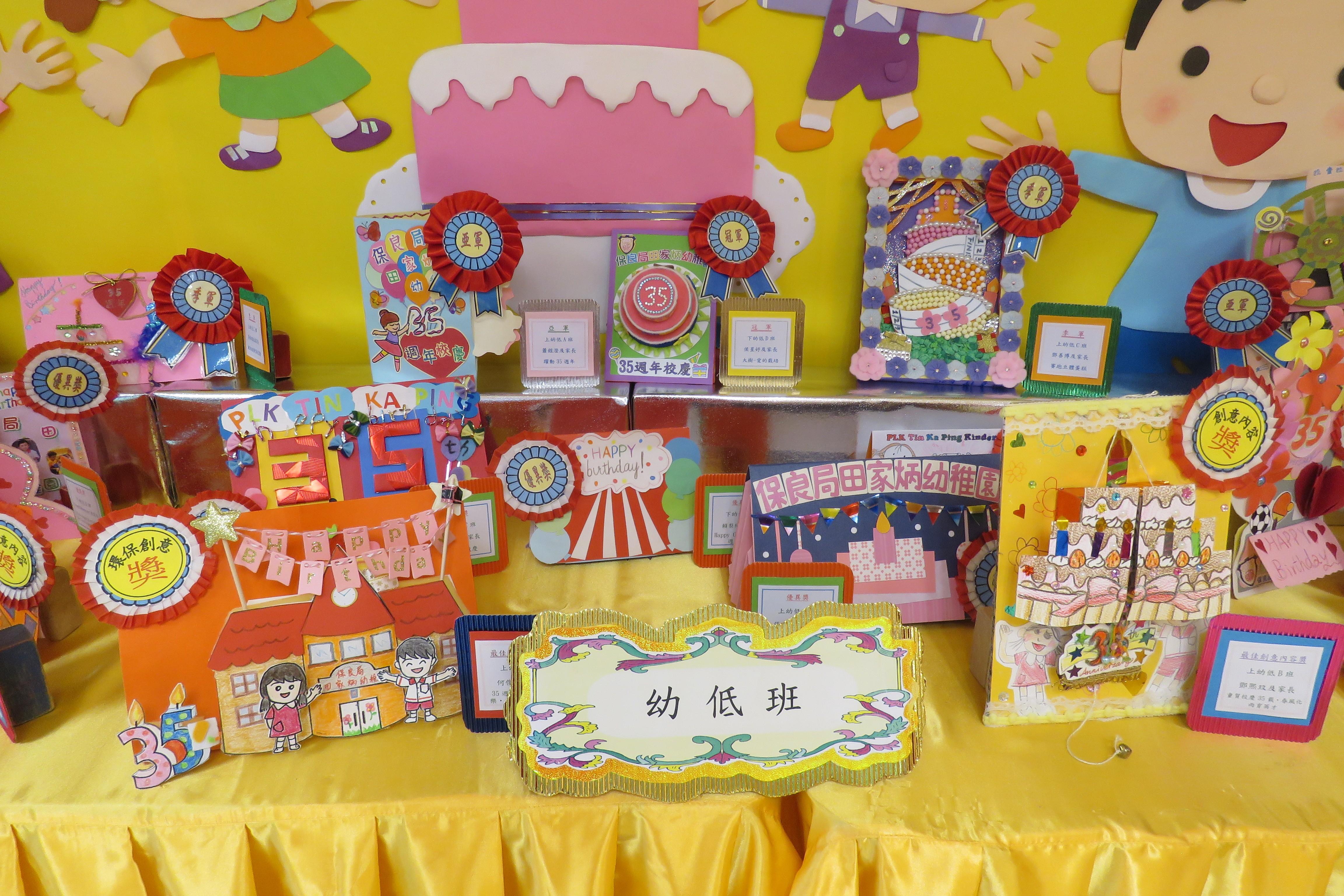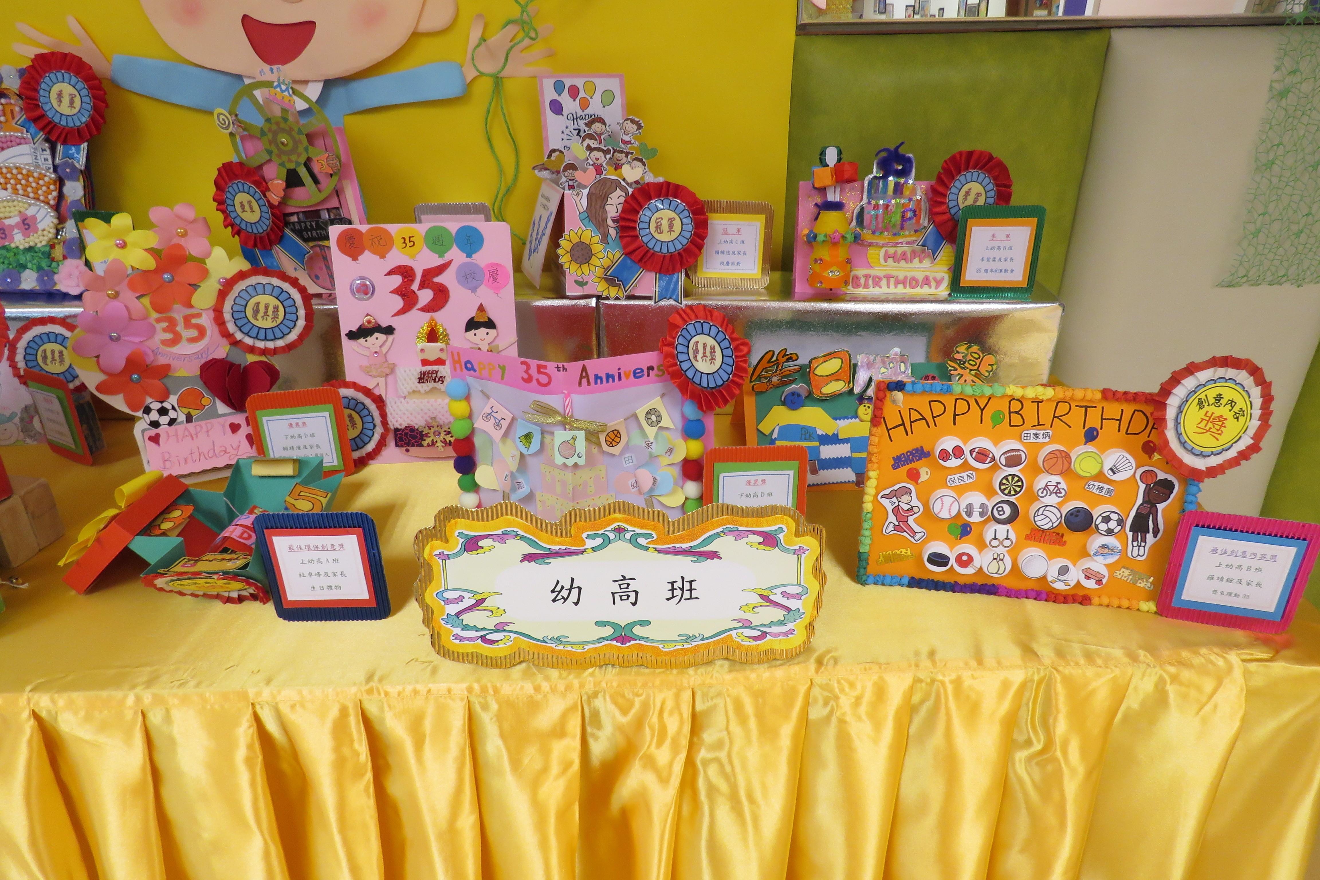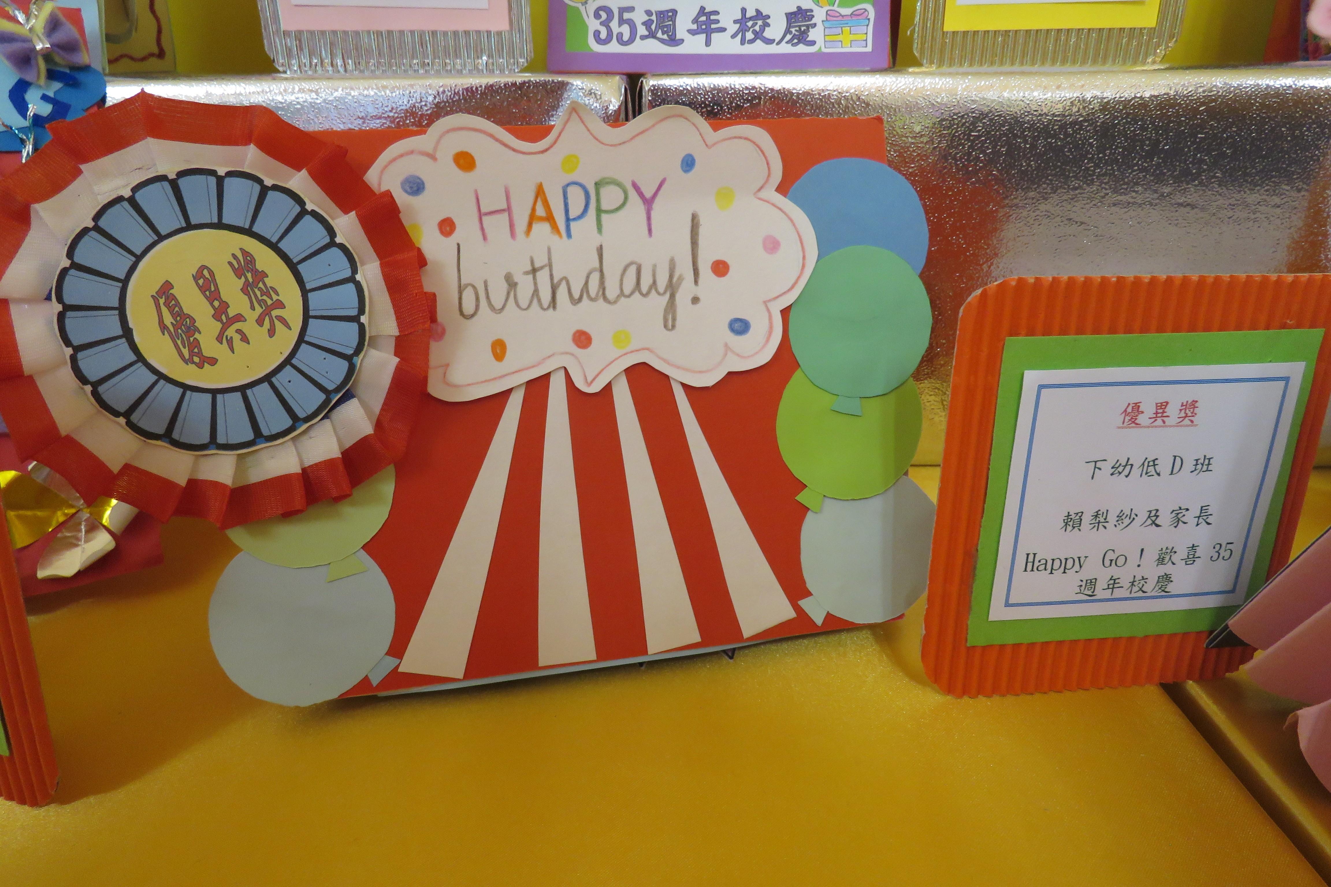 35週年校慶生日卡設計比賽 已完滿結束,各家長積極參與及支持,共收集了171份參賽作品。經本園評審後,每級選出冠、亞、季各一名,最佳創意內容奬各一名,最佳環保創意奬各一名,優異奬各四名,得奬作品如下 :