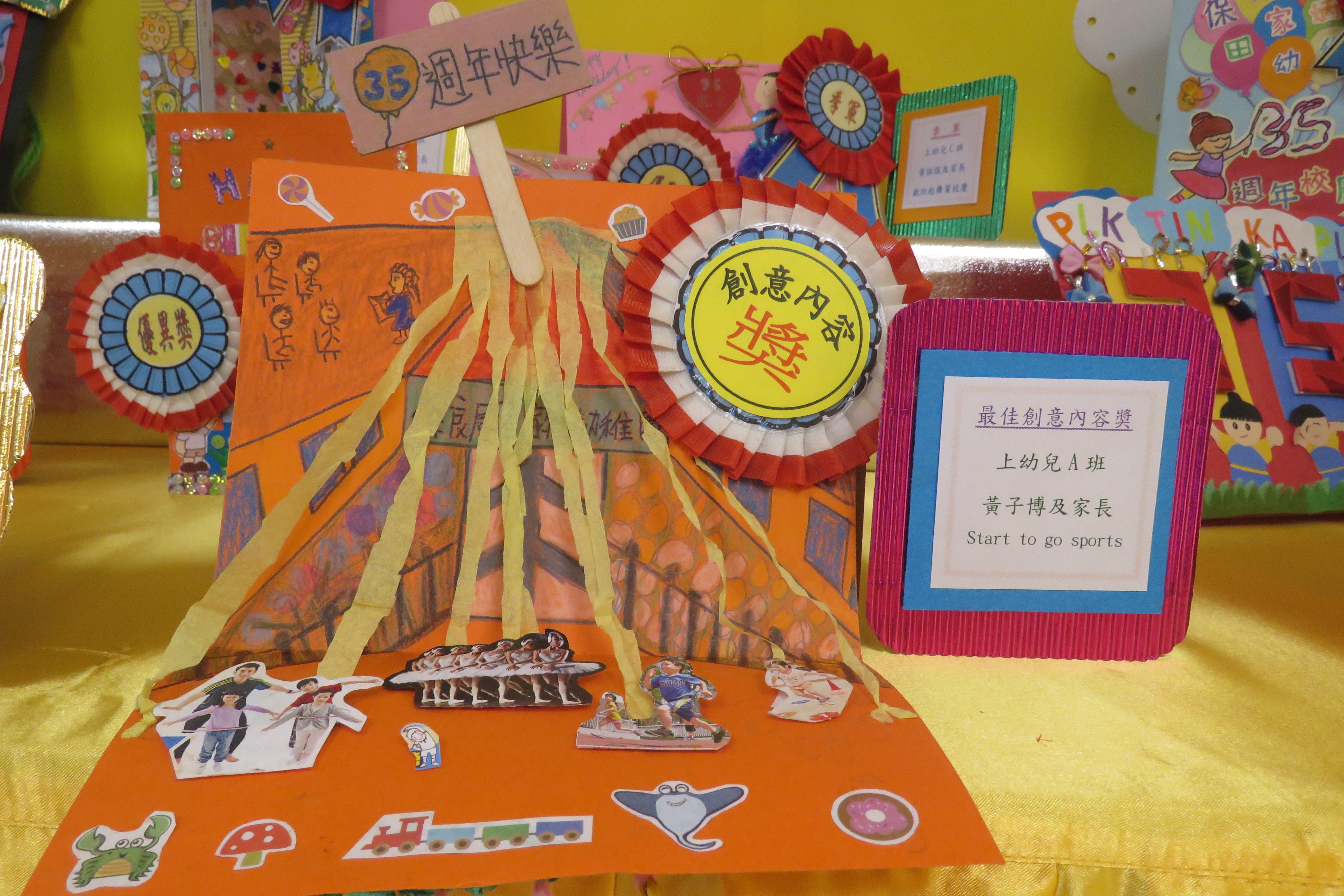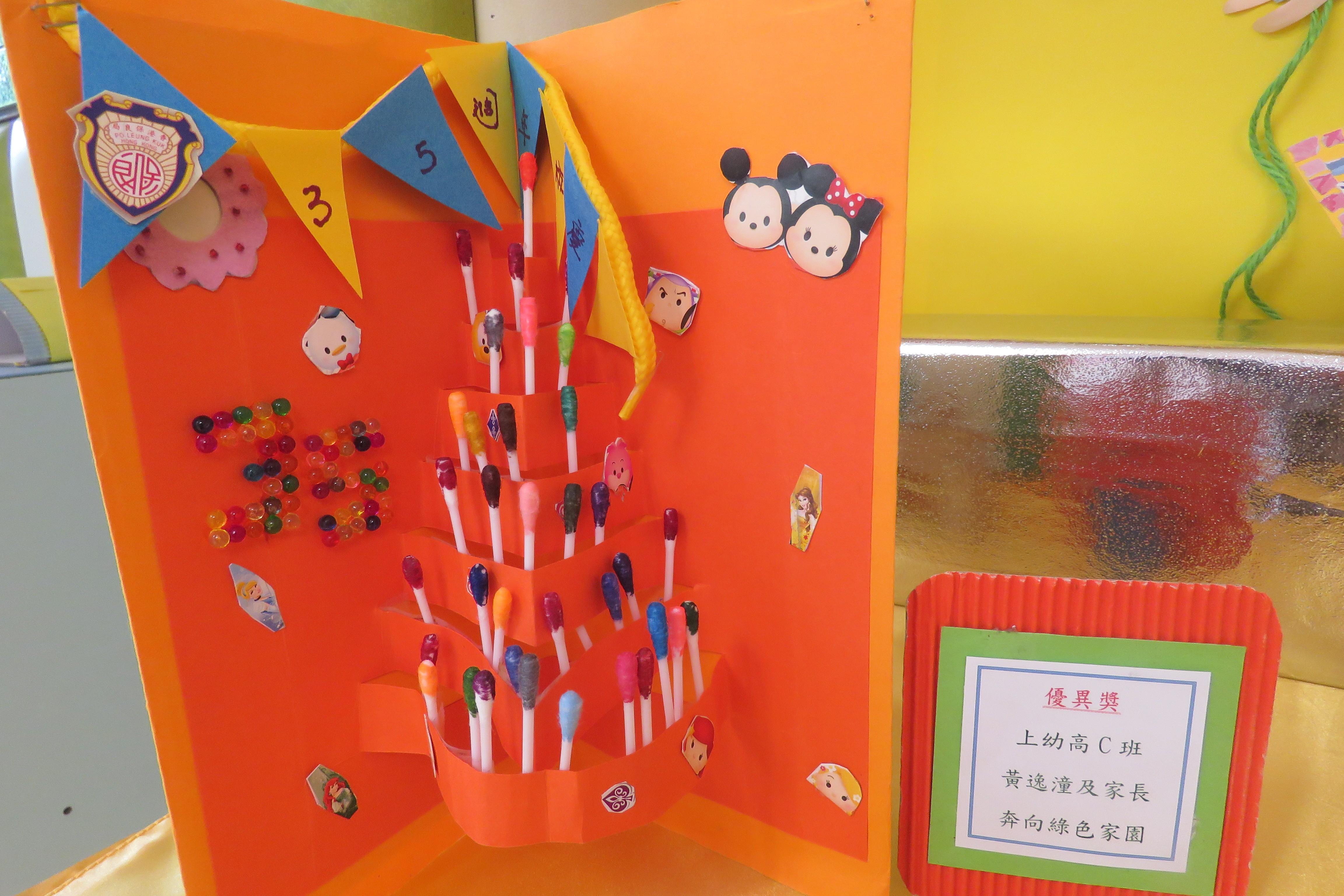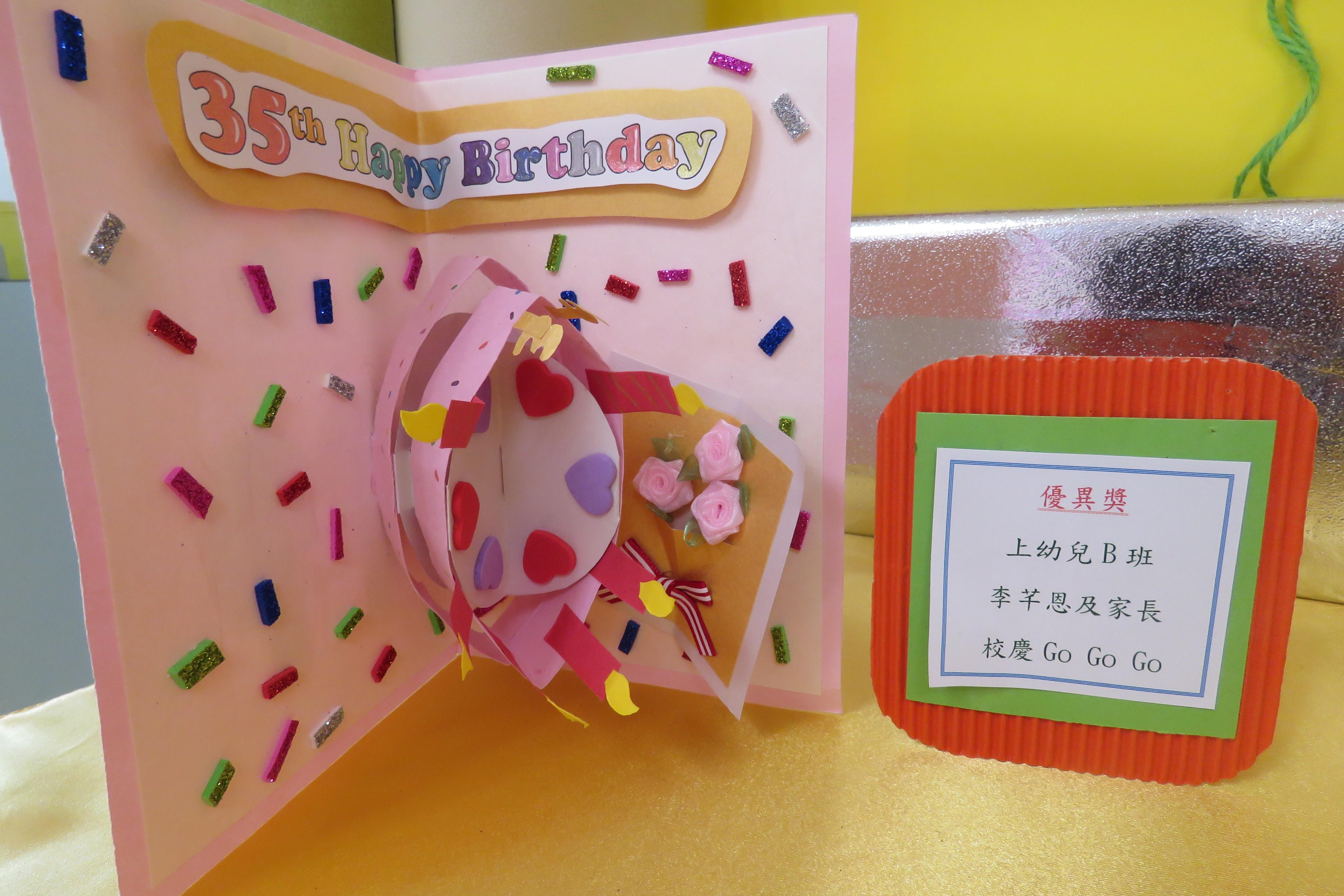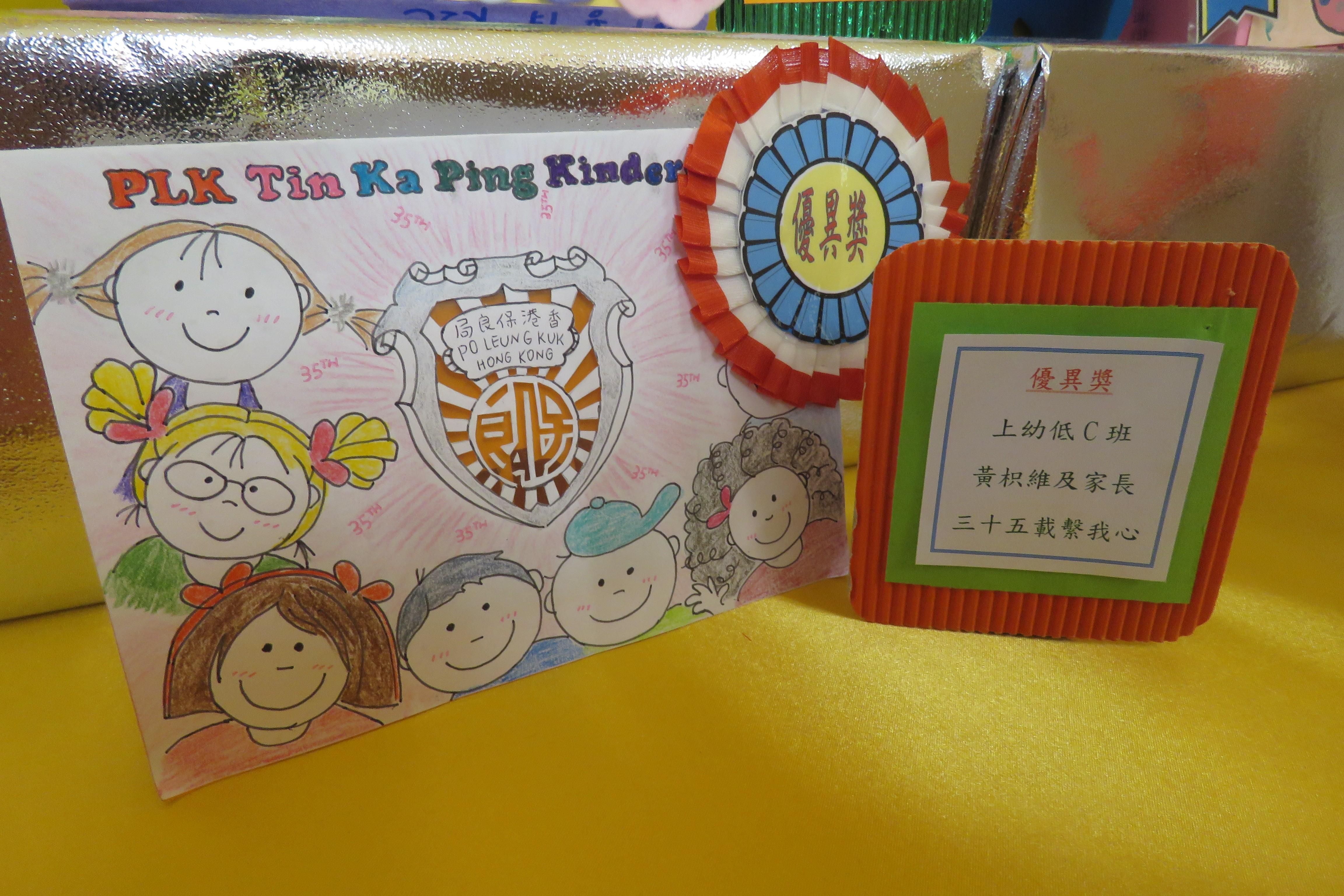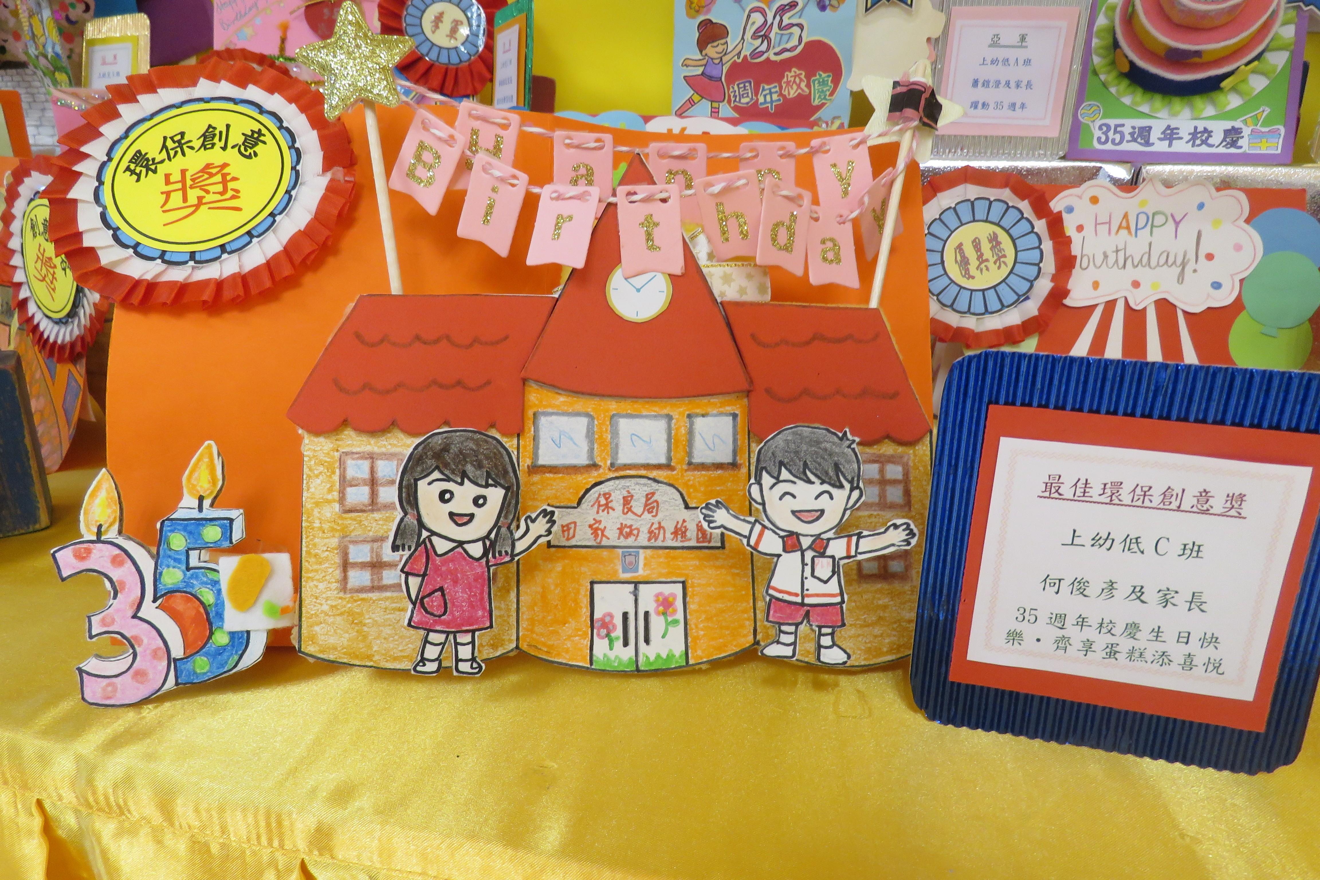 35週年校慶生日卡設計比賽 已完滿結束,各家長積極參與及支持,共收集了171份參賽作品。經本園評審後,每級選出冠、亞、季各一名,最佳創意內容奬各一名,最佳環保創意奬各一名,優異奬各四名,得奬作品如下 :