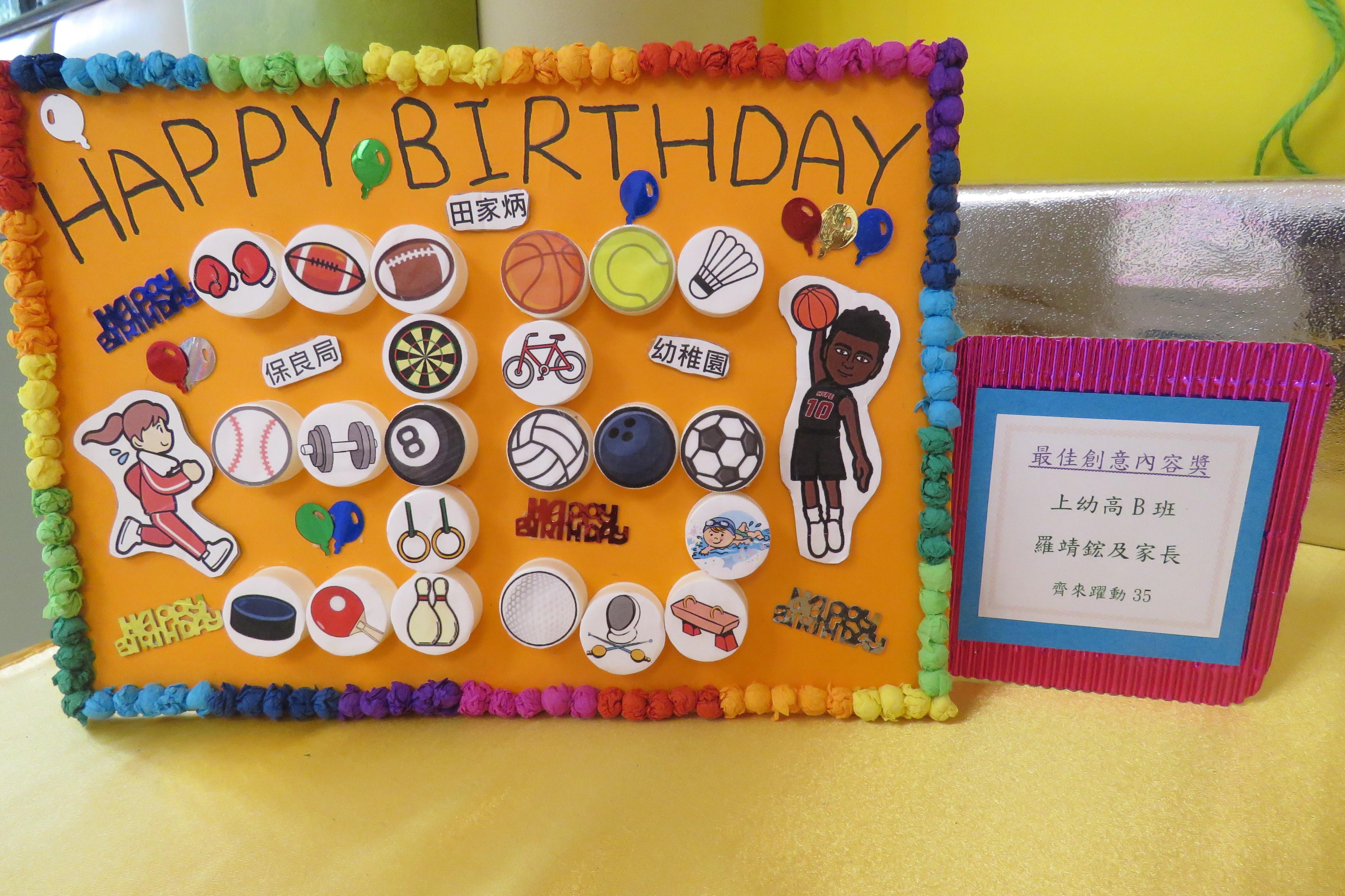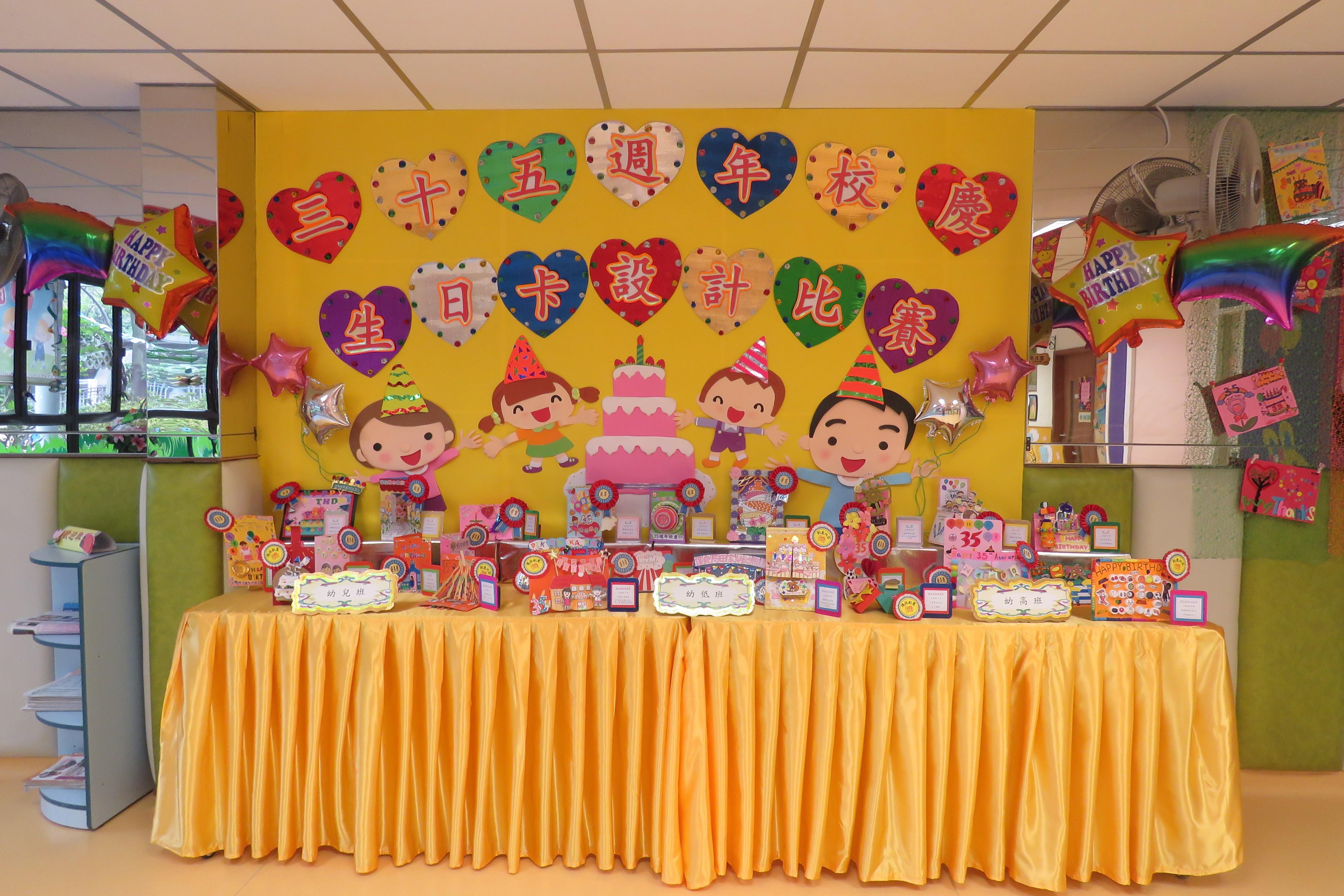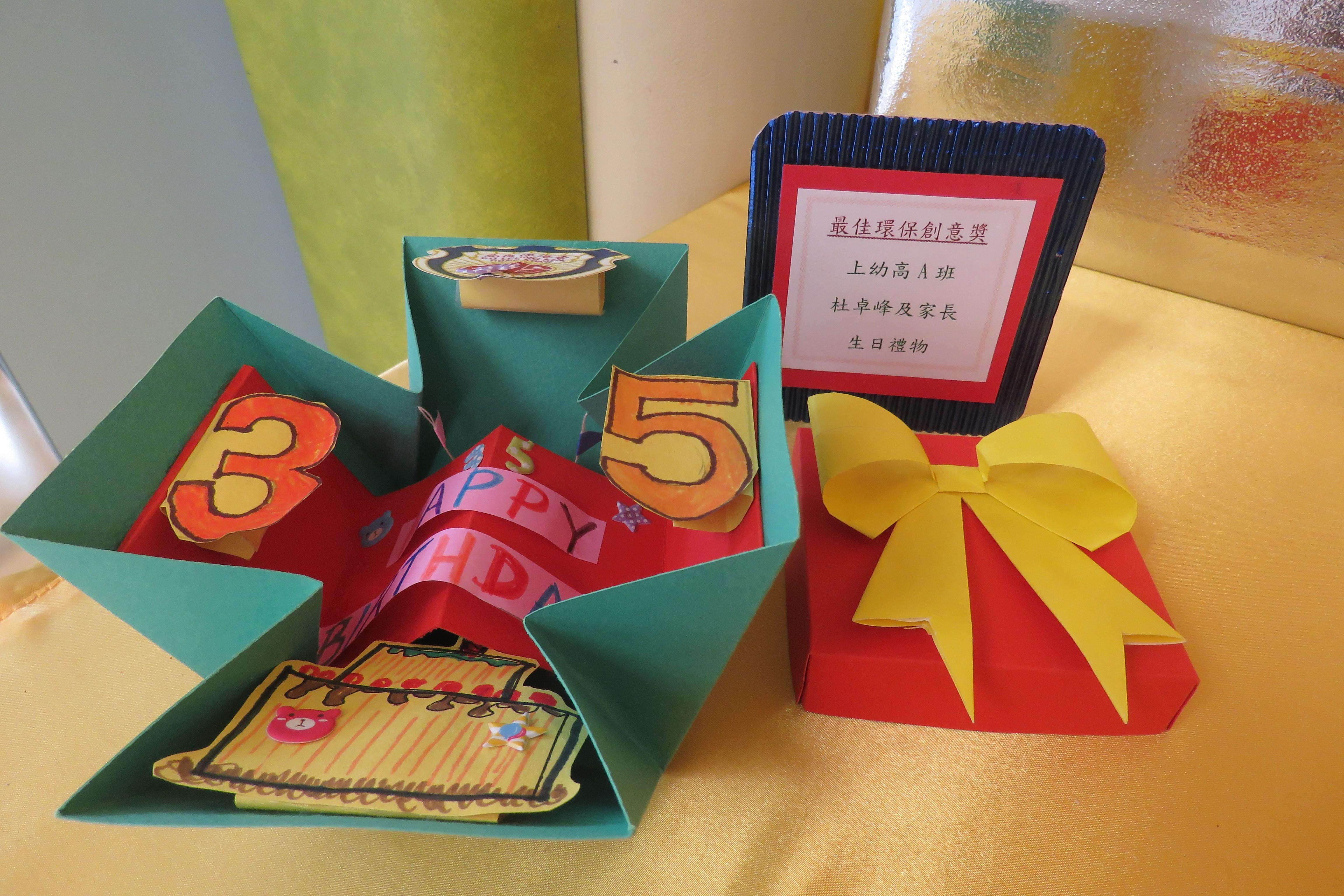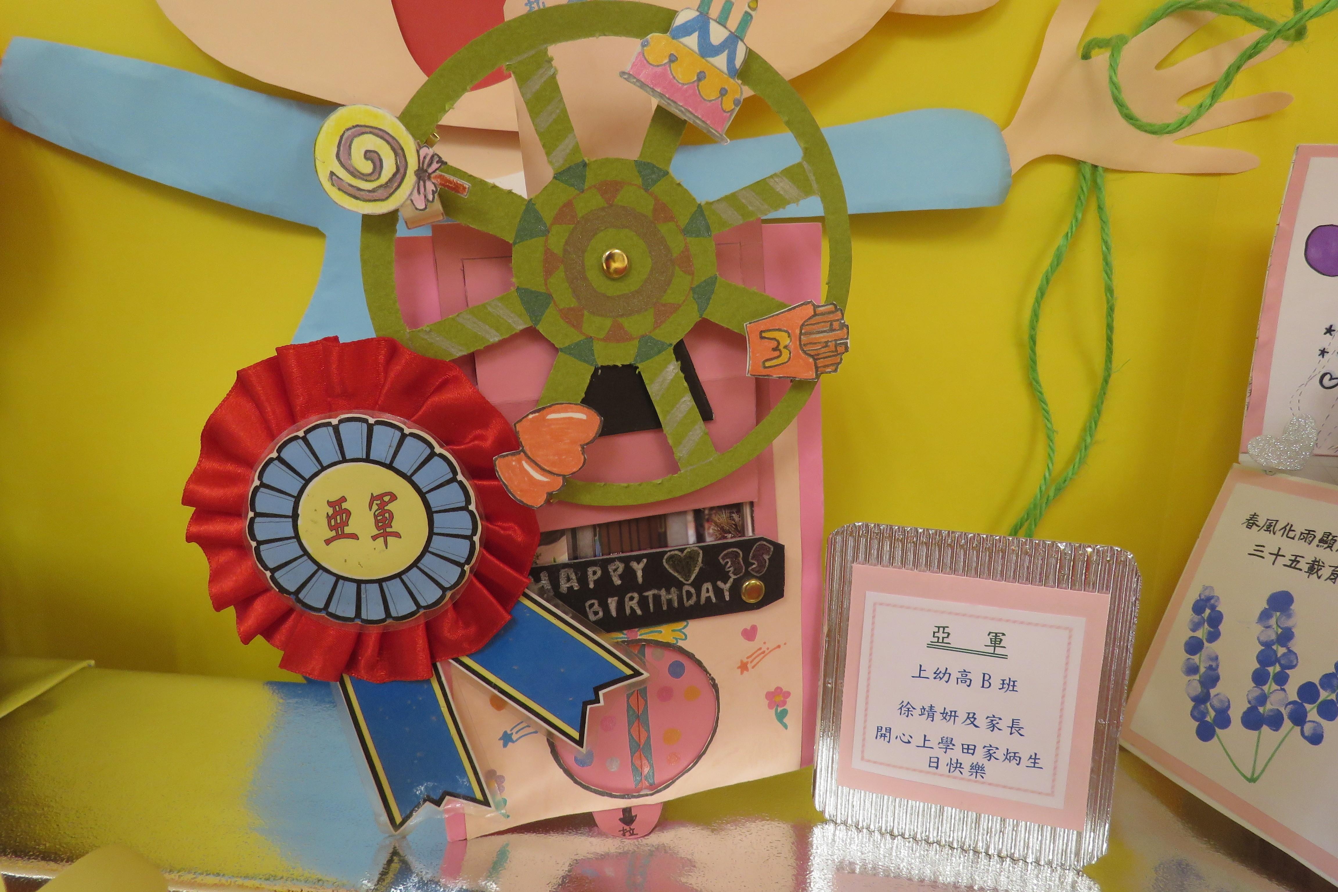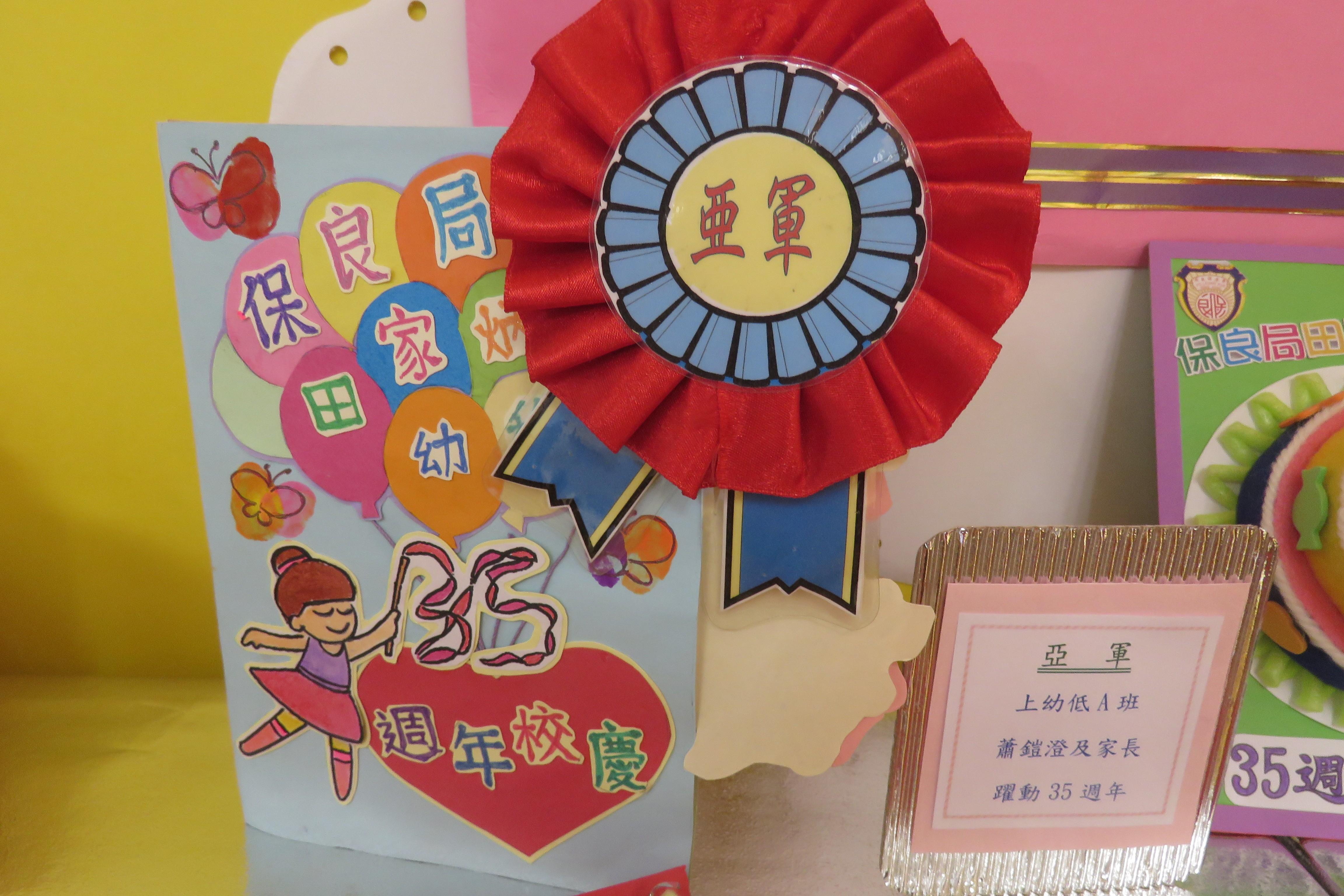 35週年校慶生日卡設計比賽 已完滿結束,各家長積極參與及支持,共收集了171份參賽作品。經本園評審後,每級選出冠、亞、季各一名,最佳創意內容奬各一名,最佳環保創意奬各一名,優異奬各四名,得奬作品如下 :