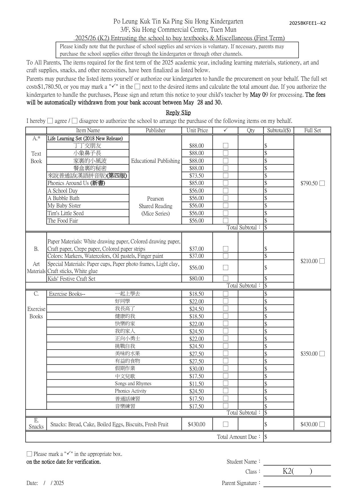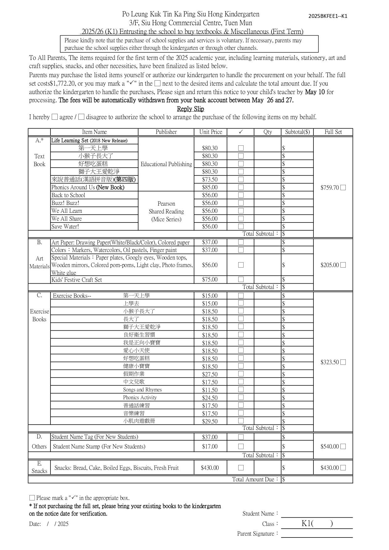 2025/26 (K1) Entrusting the school to buy textbooks & Miscellaneous (First Term)