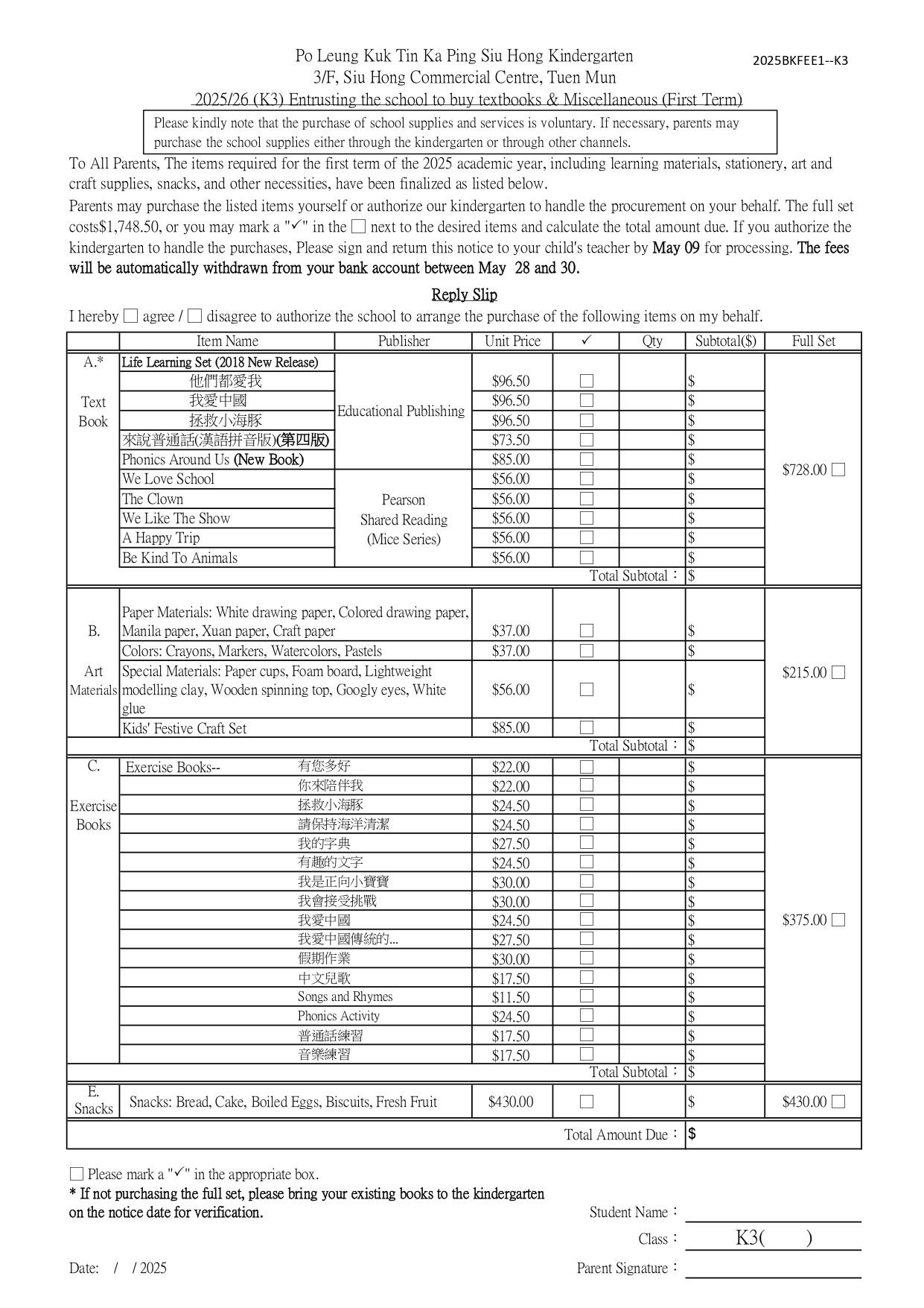2025/26 (K3) Entrusting the school to buy textbooks & Miscellaneous (First Term)