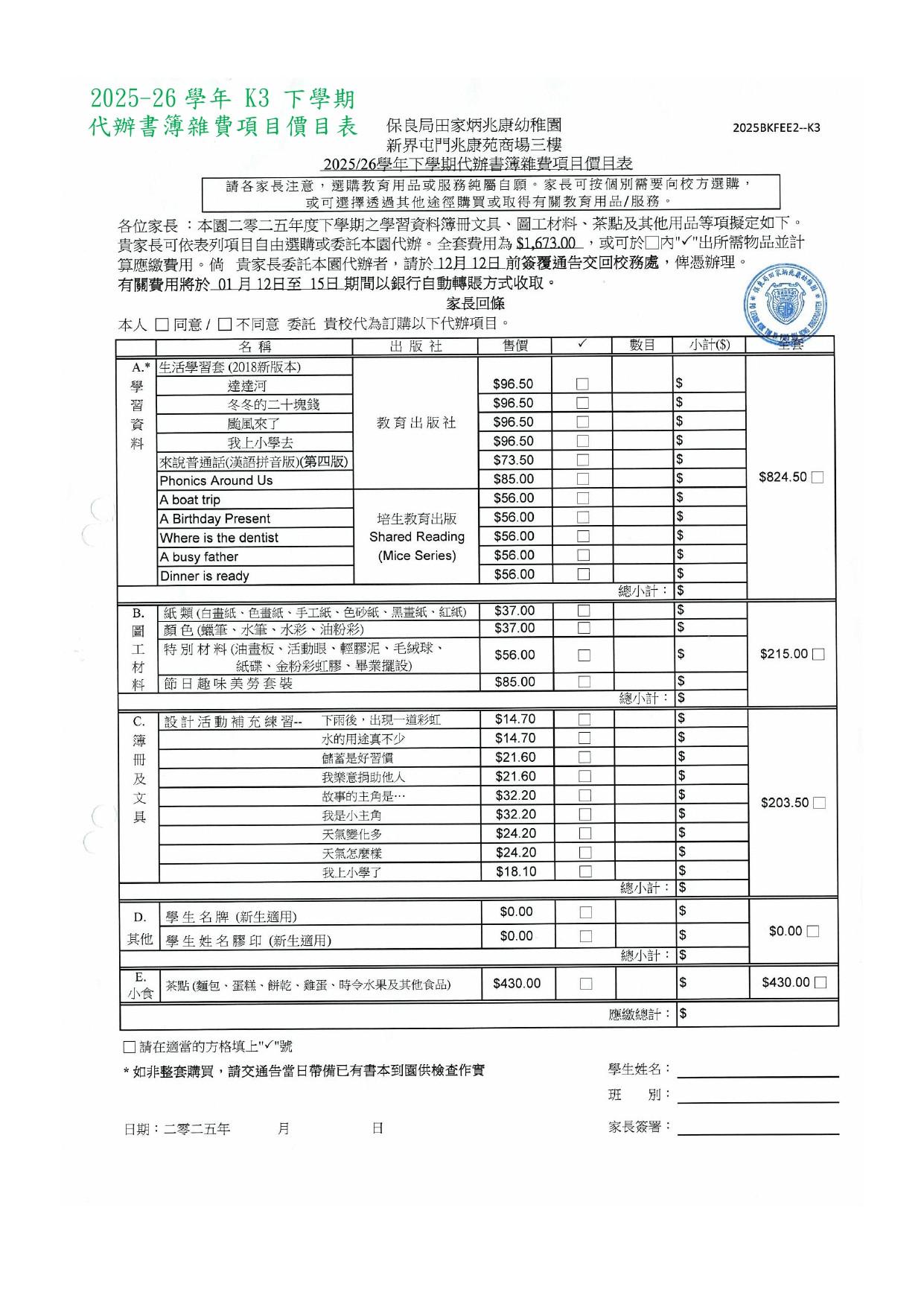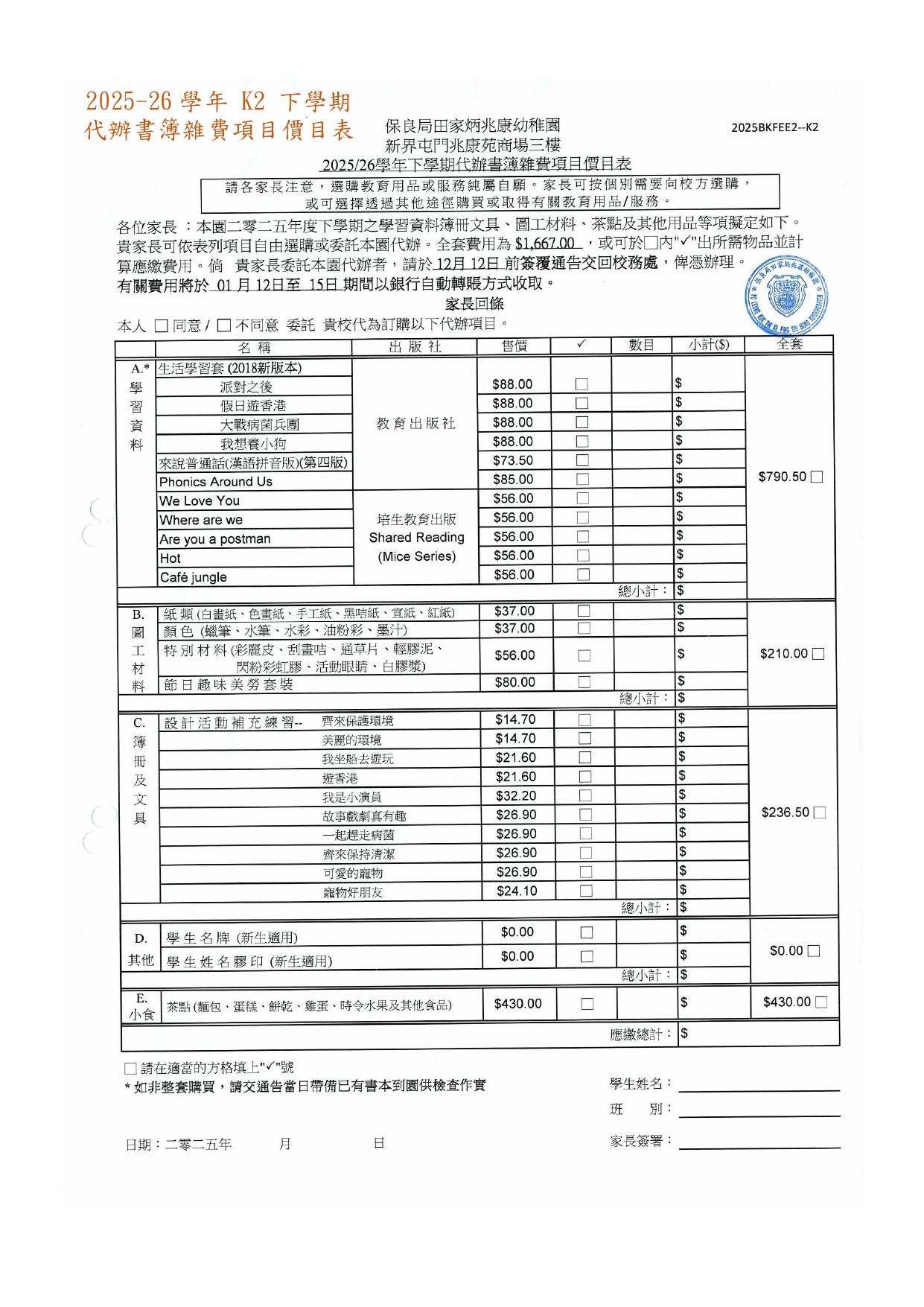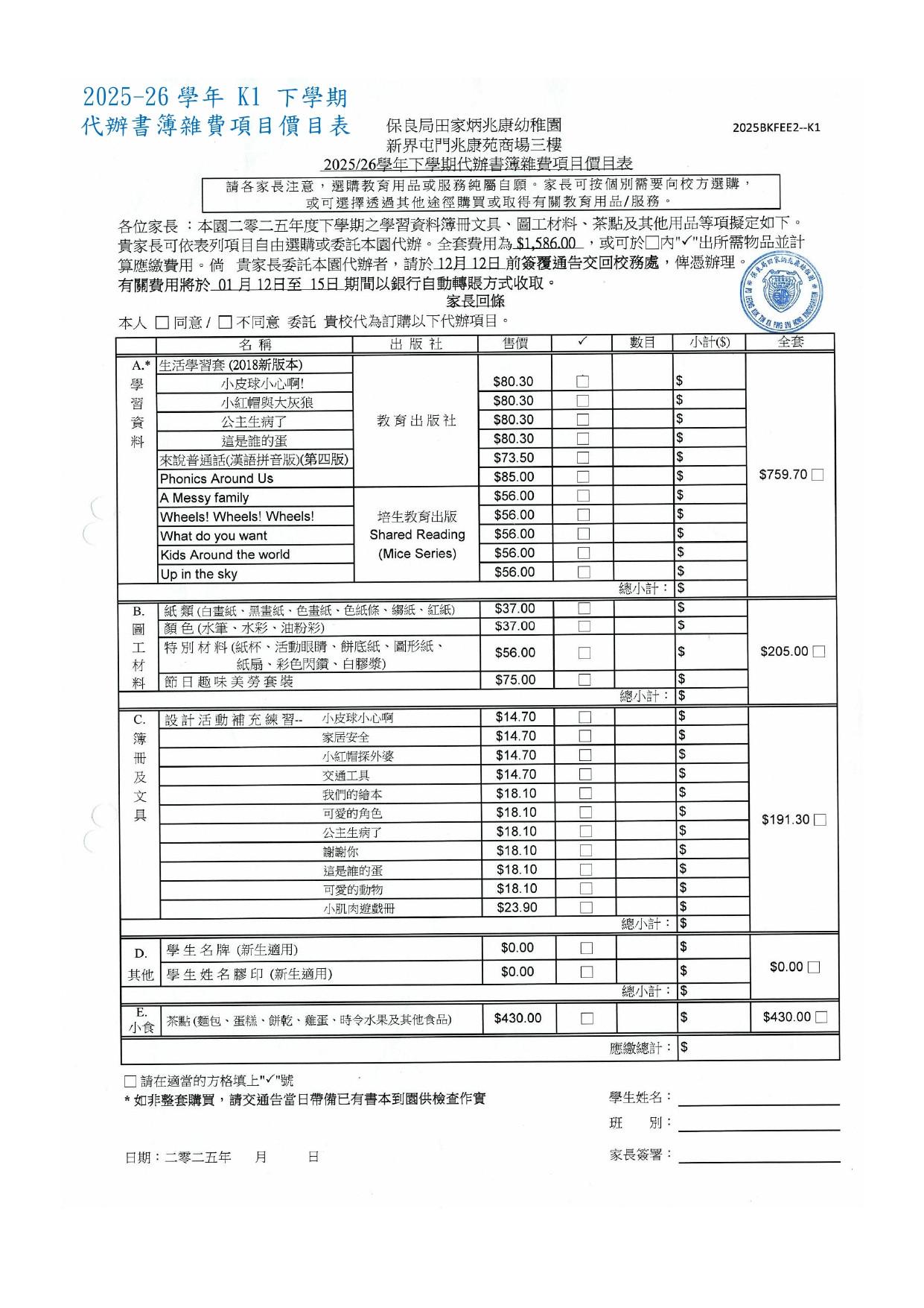 2025-2026年度下學期學生書簿雜費
