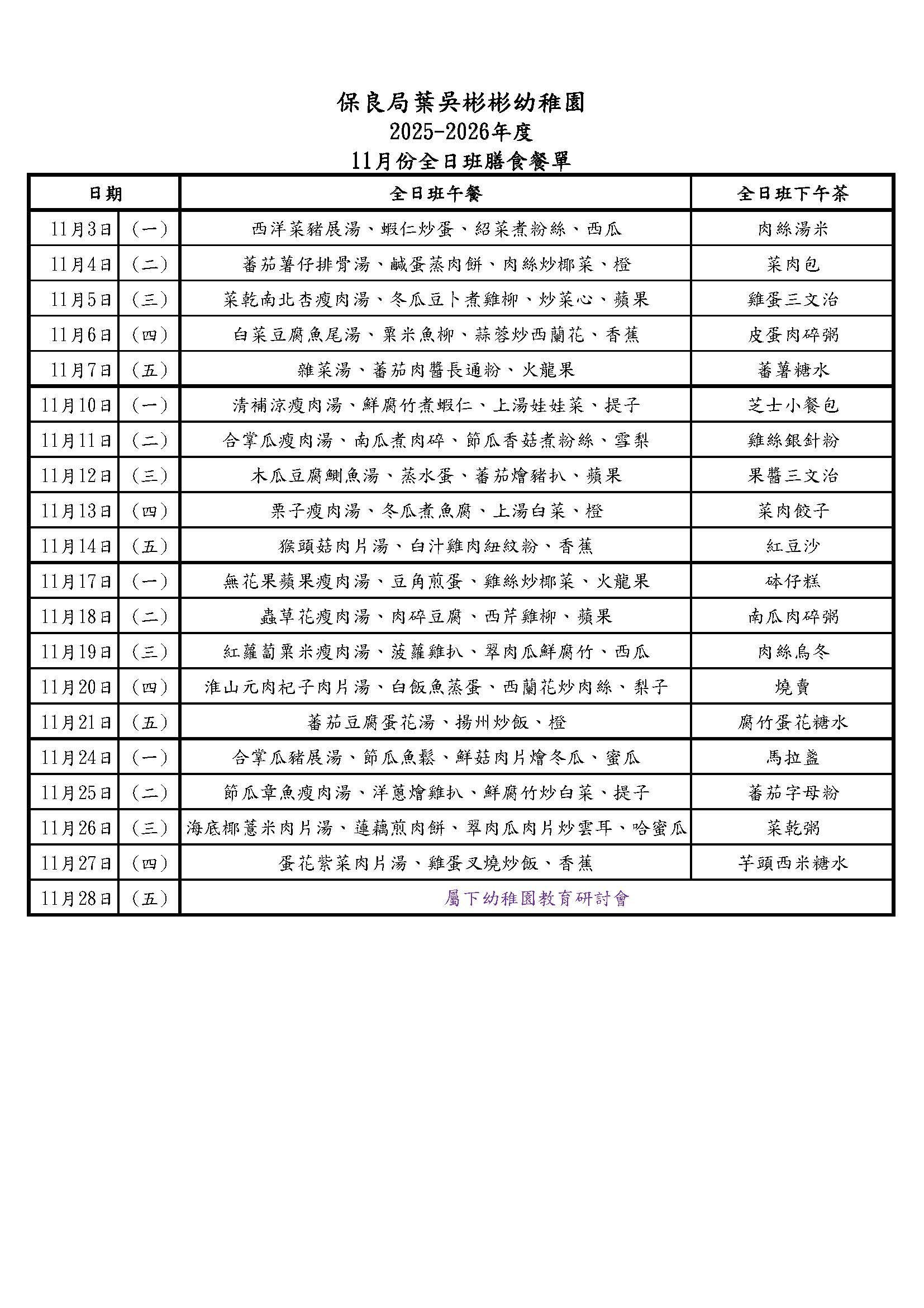 11月份全日班膳食餐單