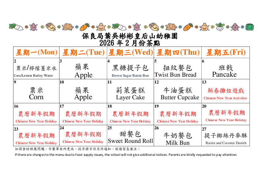 Menu of Snack (Half Day Class-February)