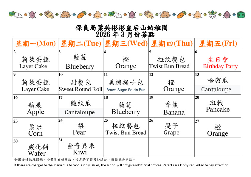 3月半日班茶點表
